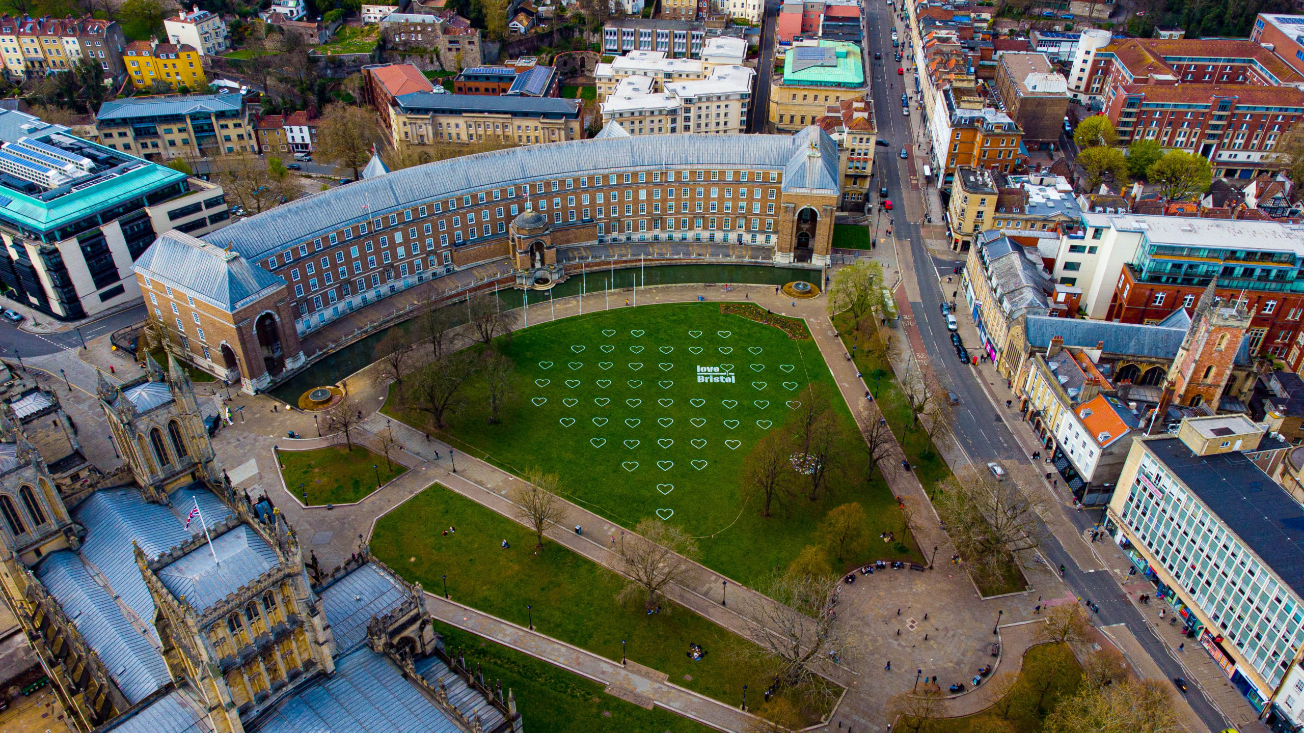 Bird’s eye view of Bristol City Centre BID Hearts initiative on College Green – photo: Plaster