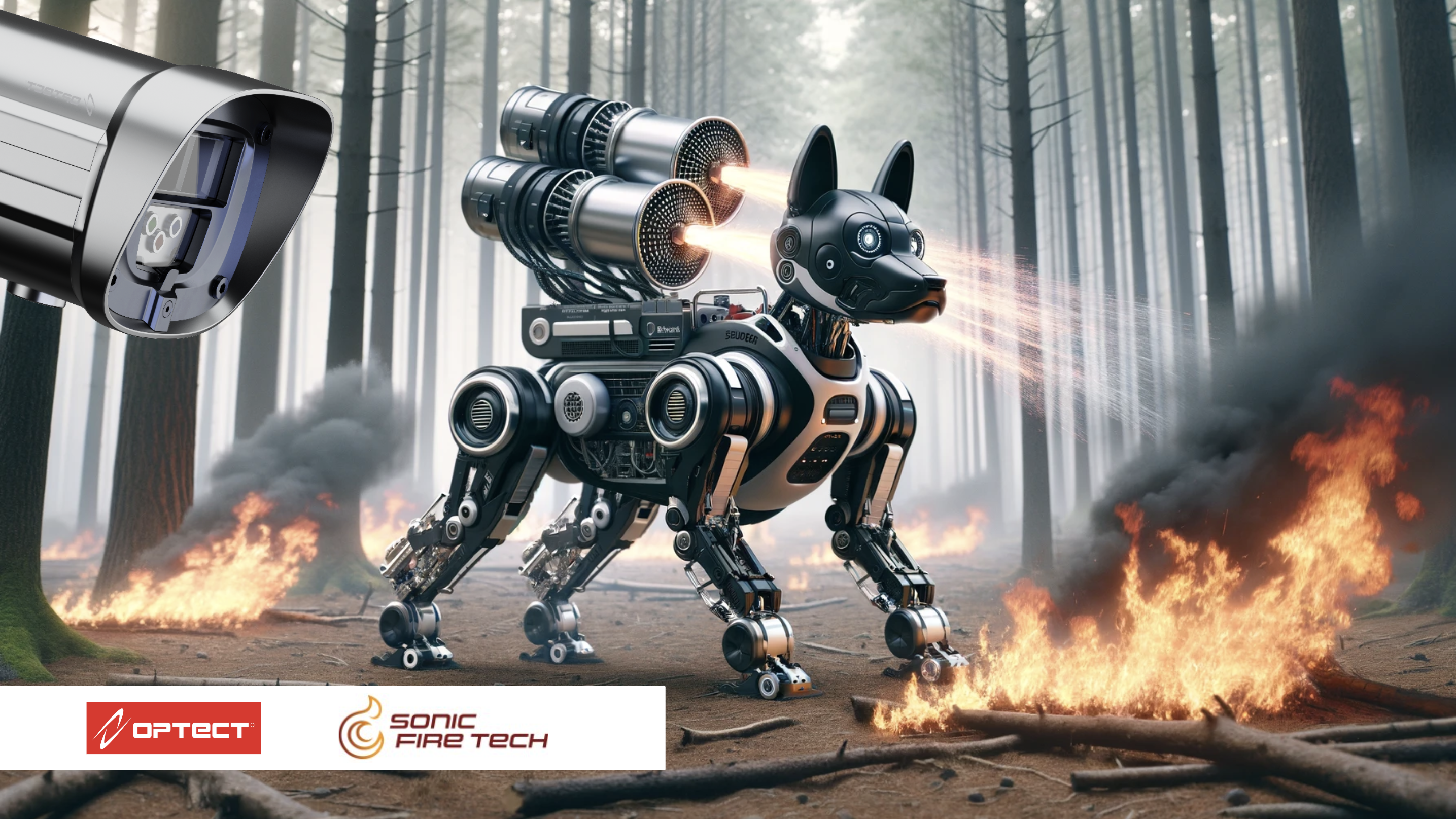 Optect’s solution uses drones to spot fires from high in the sky and flying robot taxis that deploy fire-extinguishing robotic dogs to zap flames with sound waves.