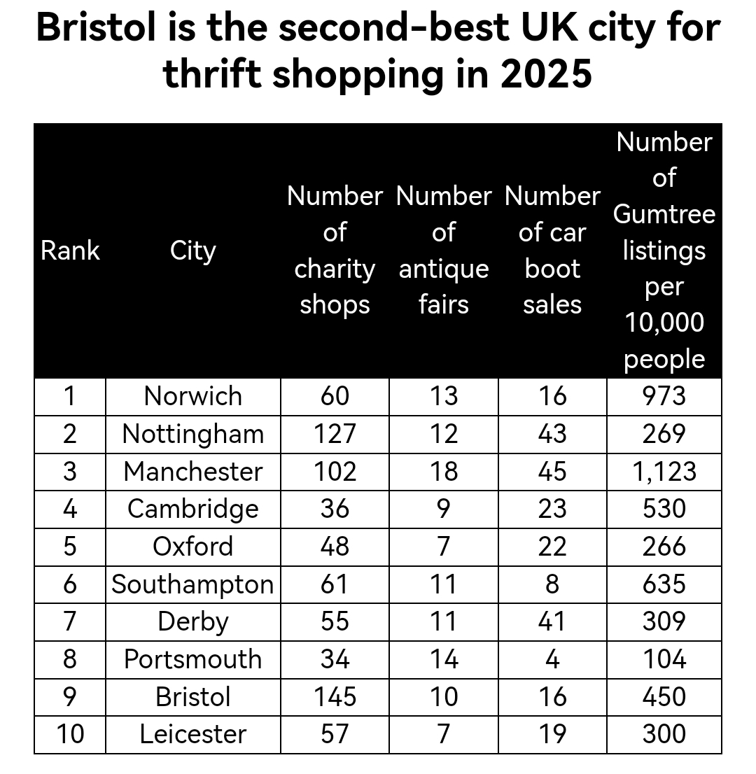 Meanwhile, a study by The Co-operative Bank placed Bristol ninth in the overall spendthrift rankings, with Norwich clinching the top spot with four charity shops per square mile. Manchester secured third place, with almost 45,000 listings for second-hand goods on Gumtree.