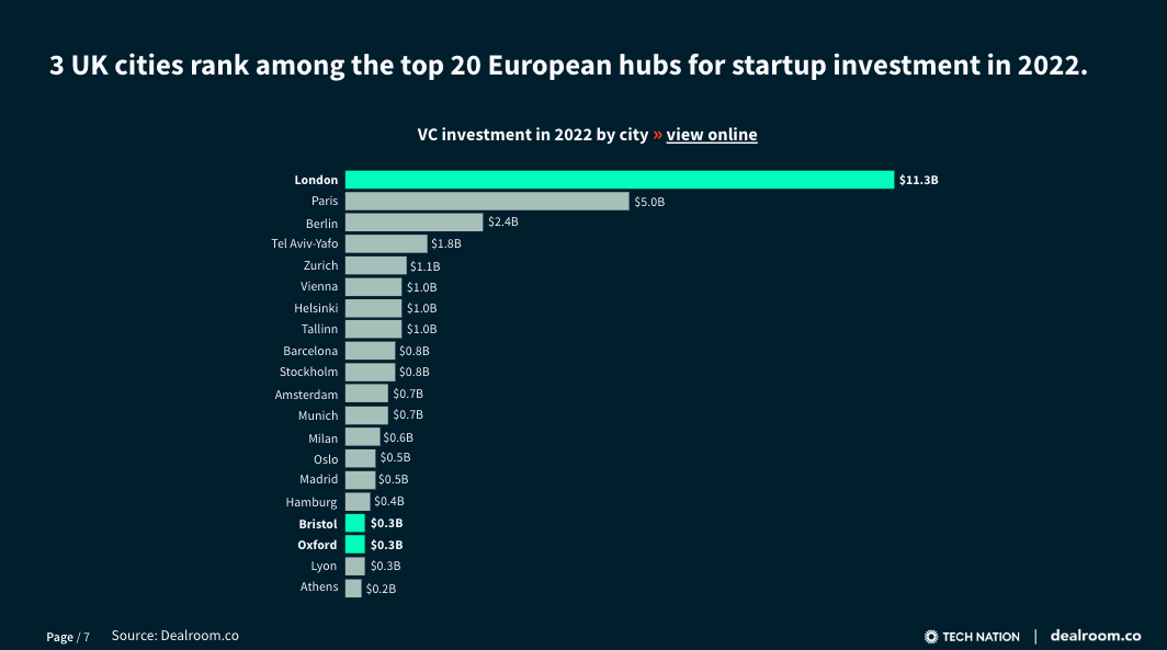 Bristol is 18th in the top European cities ranked by tech venture capital investment – image: Dealroom