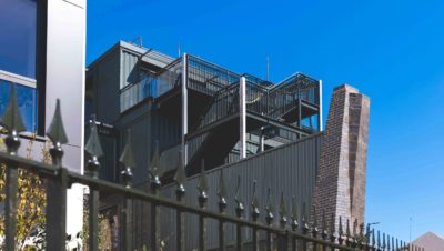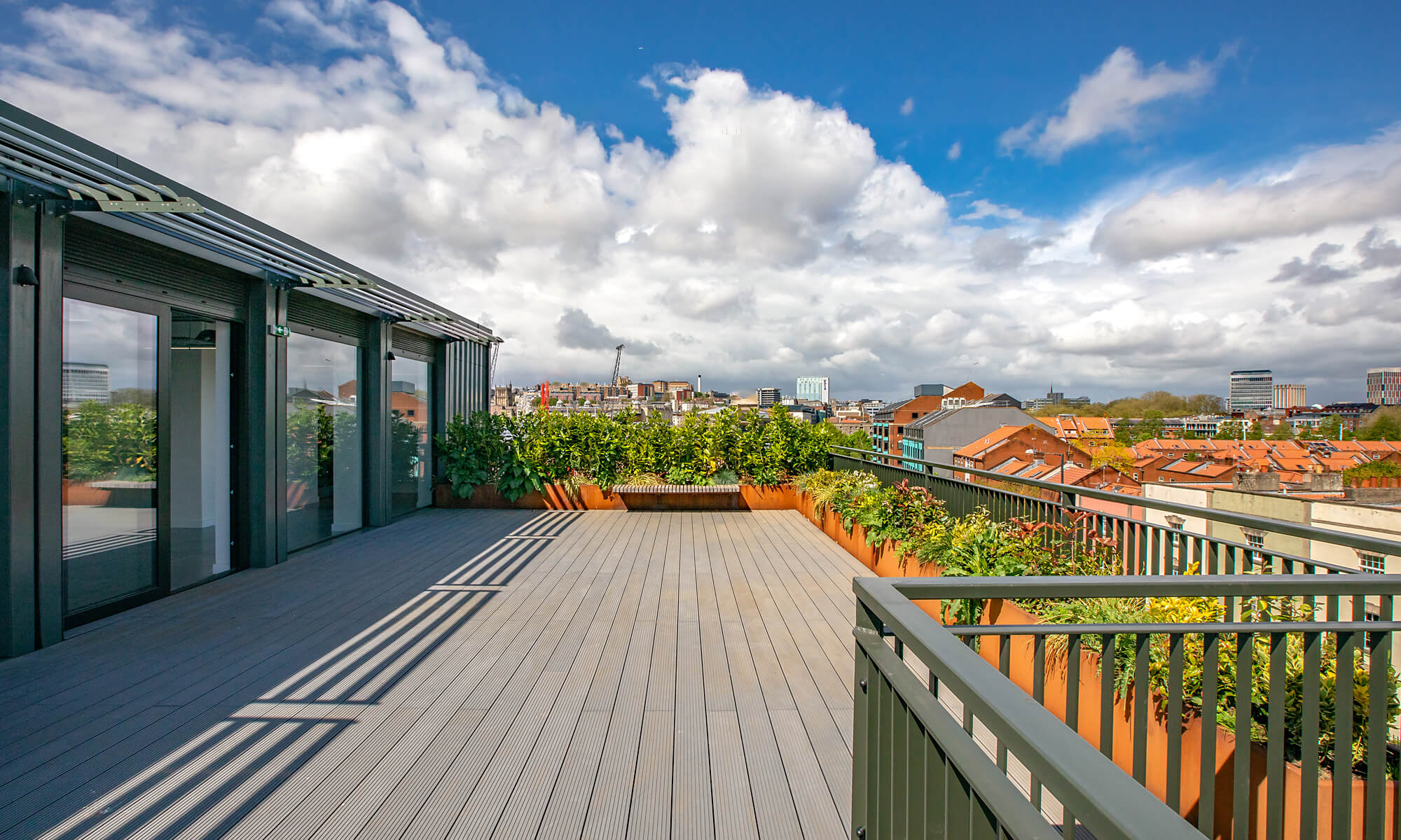 The building includes a courtyard canopy and ‘shipping container’ metal cladding, with balconies and terraces on all four floors and views over south Bristol.