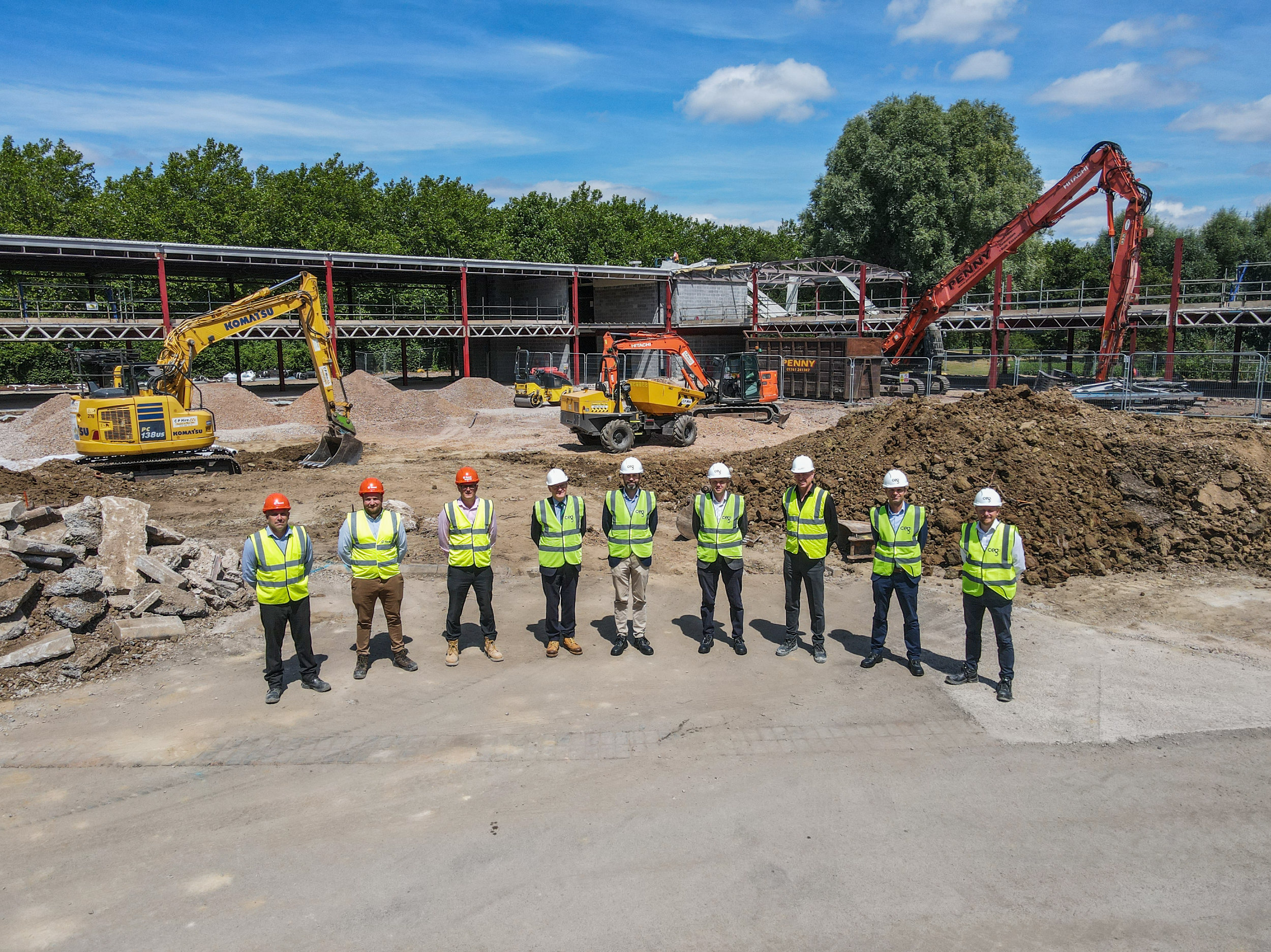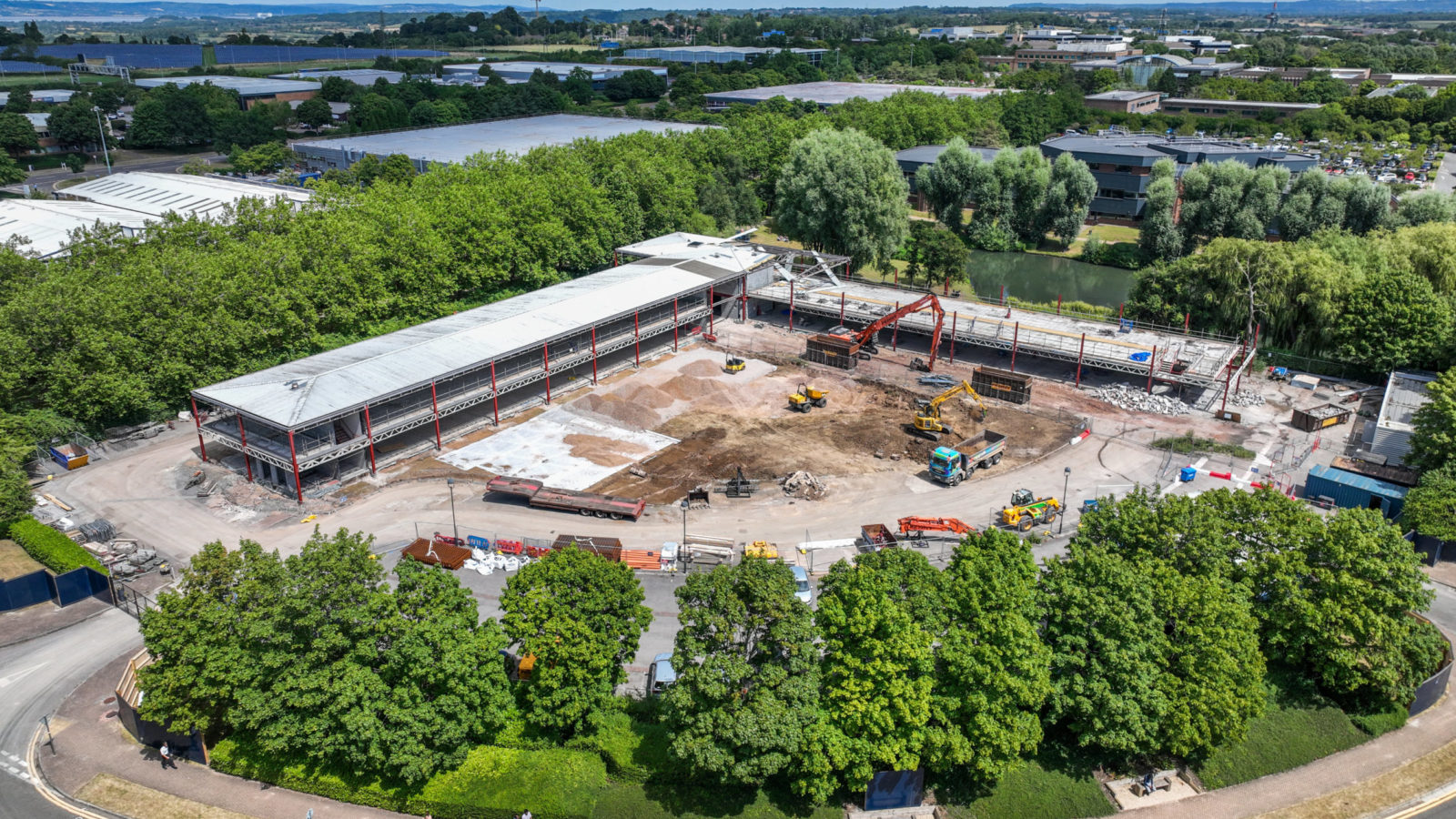 Beard Construction has retained the original 1980s footings, frame and building structure in a bid to save carbon and the team is now removing the existing roof to create a new floor and roof, which will increase capacity from 38,000 sq ft to 80,000 sq ft, creating space for an 850-strong workforce.