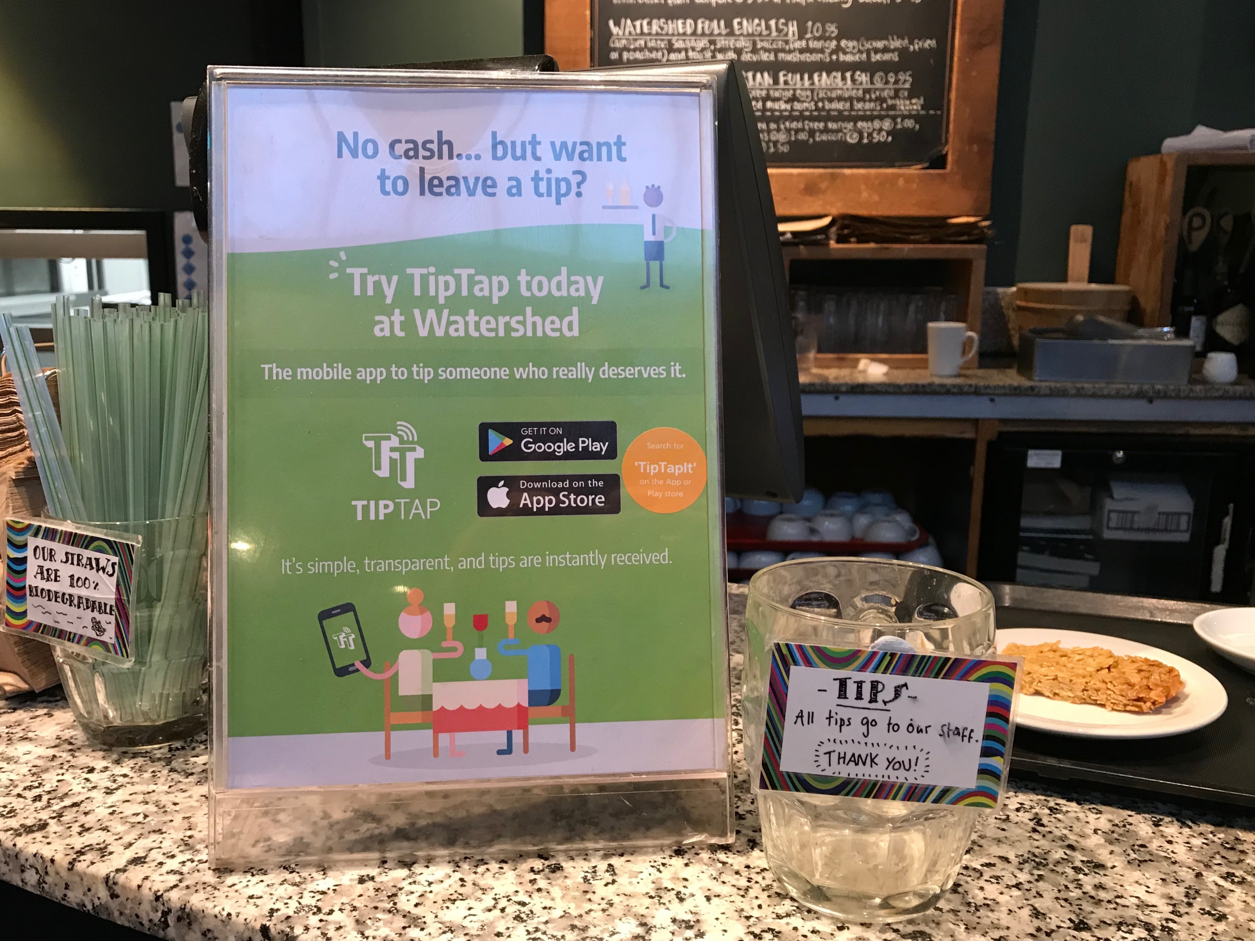 The app enables customers to give money directly to an individual member of staff, with the money going straight to their own bank account; although the team at the Watershed have decided to split all tips evenly.