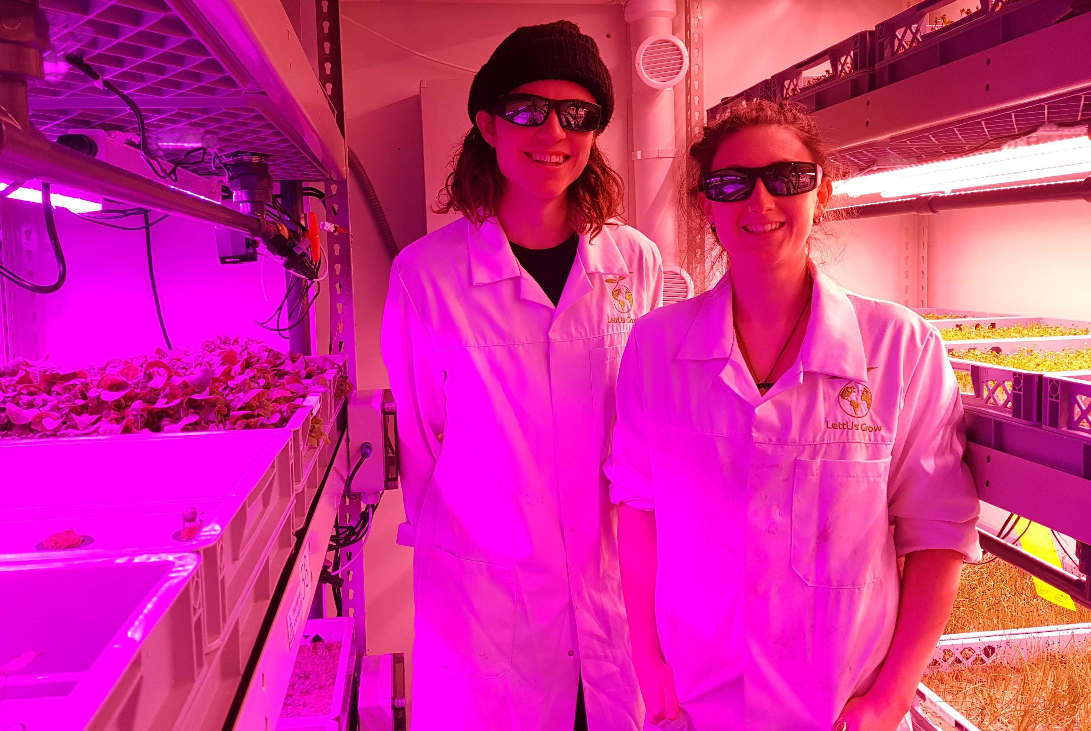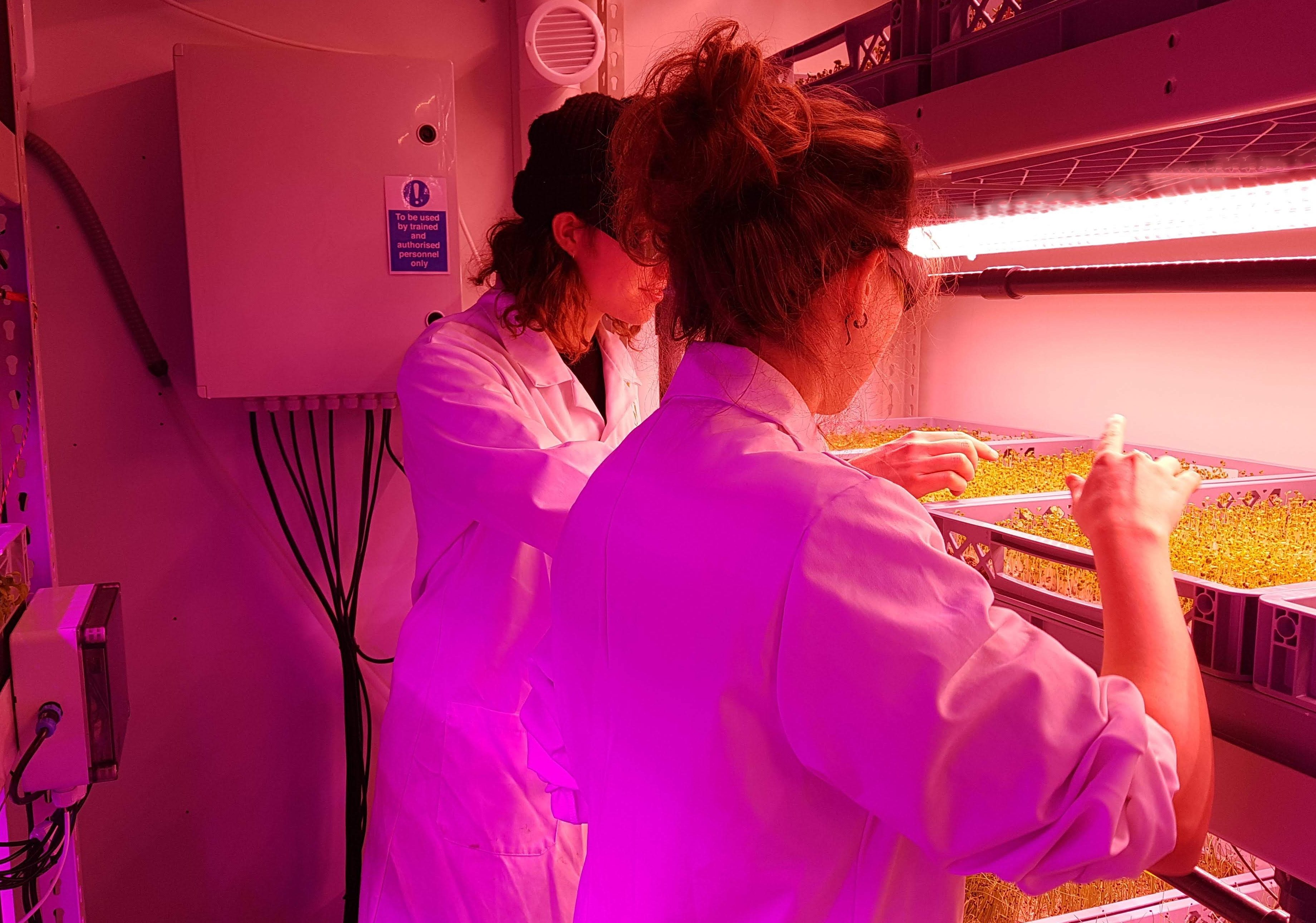 Billy and India wear protective goggles because the light in the growing area has been specially filtered to improve efficiency