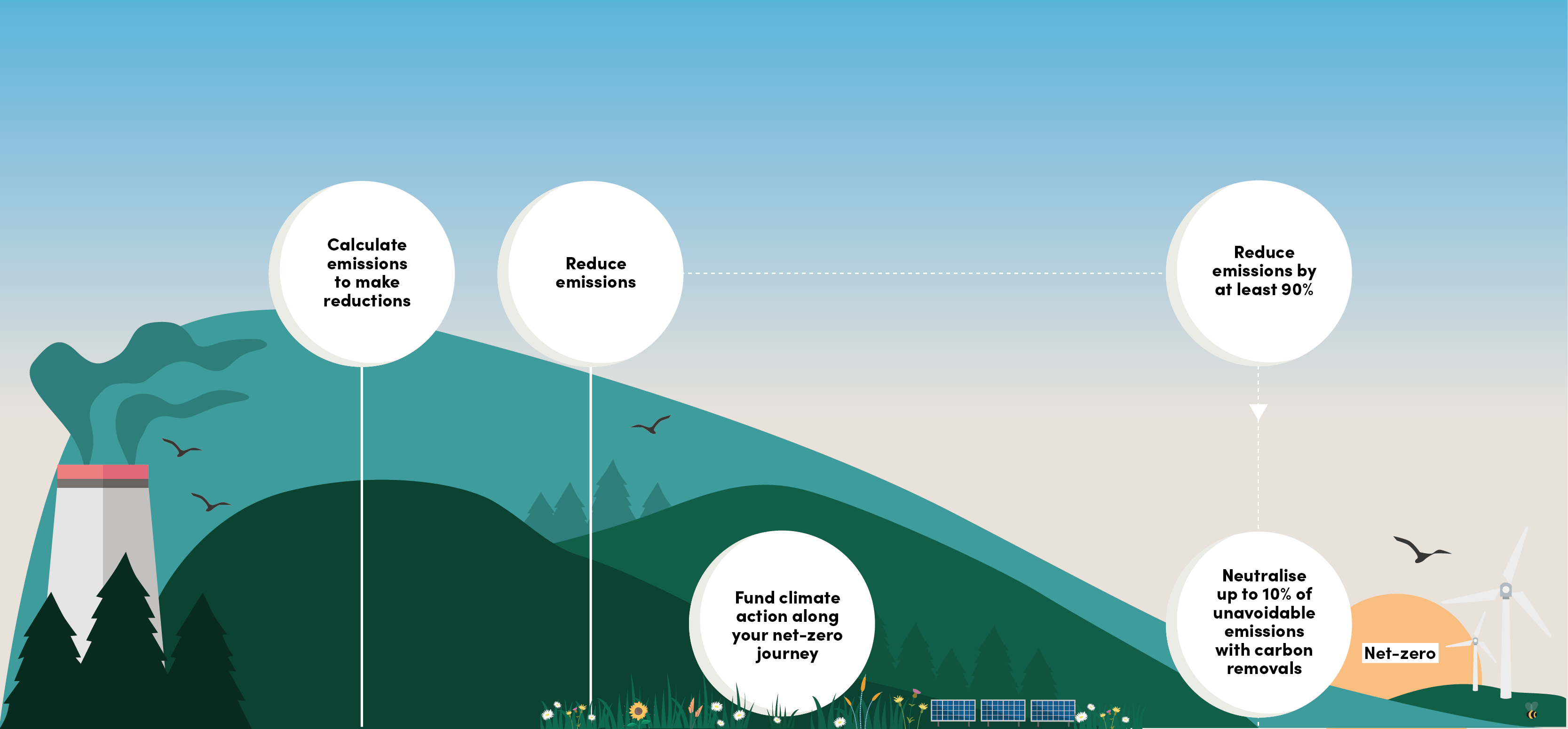 Don’t be put off by the scientific terminology. Simply, it means continuously funding climate action via high-quality carbon avoidance credits (and other types of impactful climate projects) whilst reducing your business emissions on your journey to net-zero.