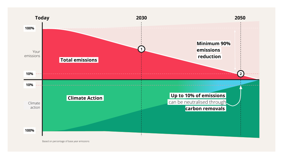 The net-zero pathway allows you to fund carbon removal credits to ‘offset’ your unavoidable emissions. However, you need to reduce your emissions as much as possible first, and only use removals for up to a maximum 10 per cent of your initial emissions, and it has to be carbon removal, which is very expensive!
