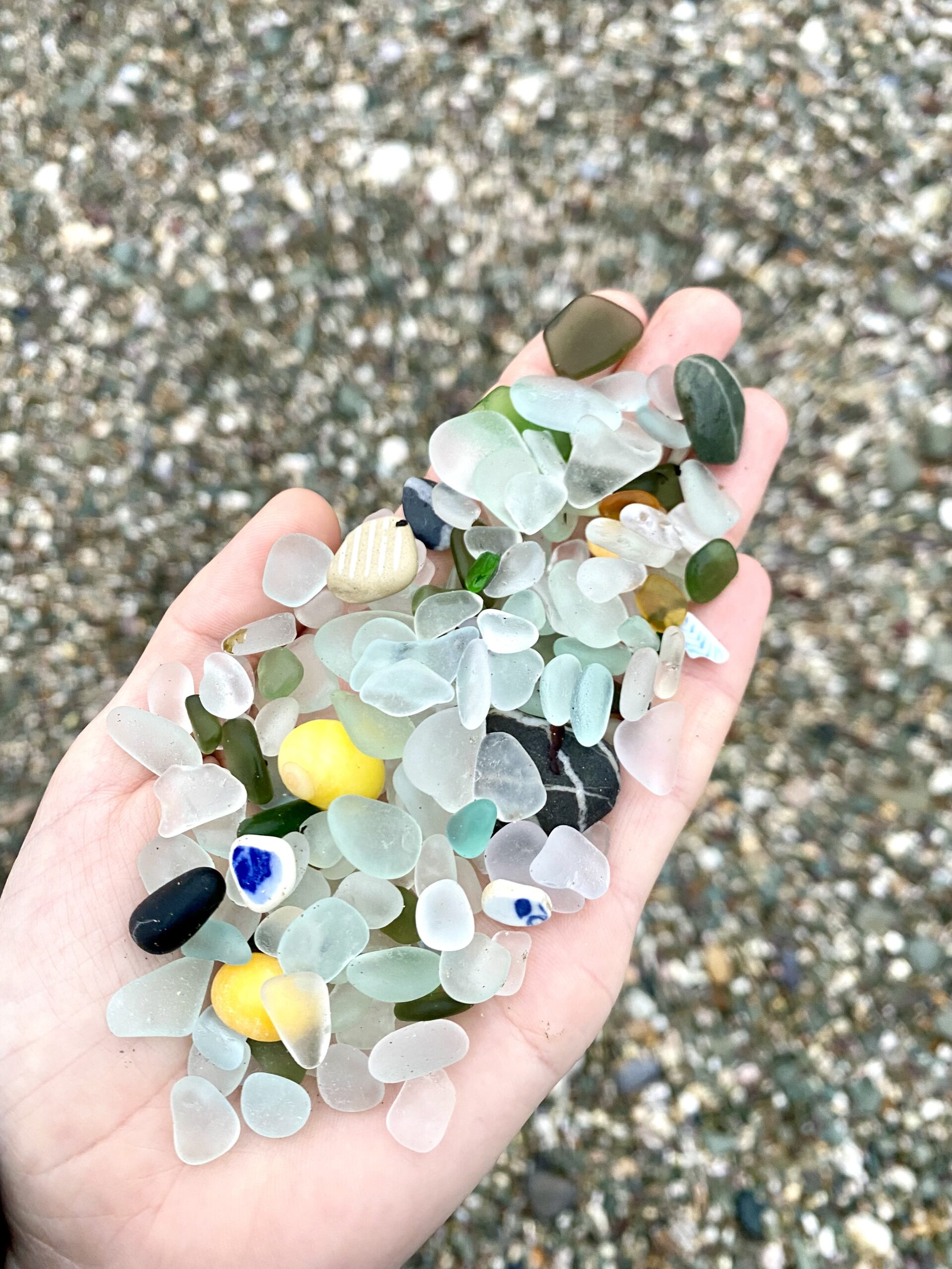 Discarded broken glass and ceramic pieces are smoothed into gem-like stones of many shades over the years due to constant contact with waves and water pressure