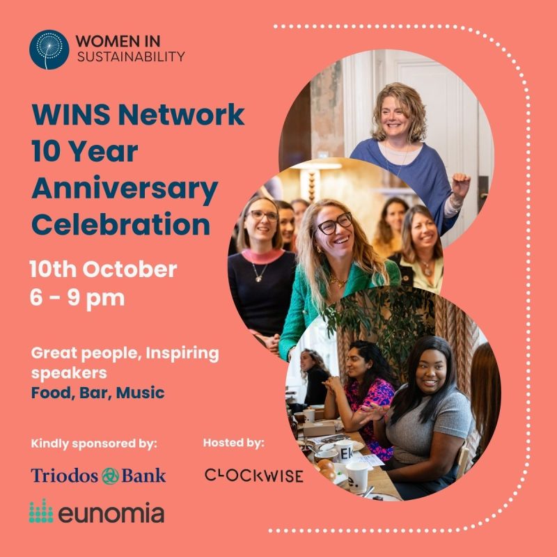The WINS Network Tenth Anniversary Celebration takes place at Clockwise on October 10 from 6-9pm. Find more information and book tickets at womeninsustainability.net/event/celebrating-10-years-of-women-in-sustainability-network