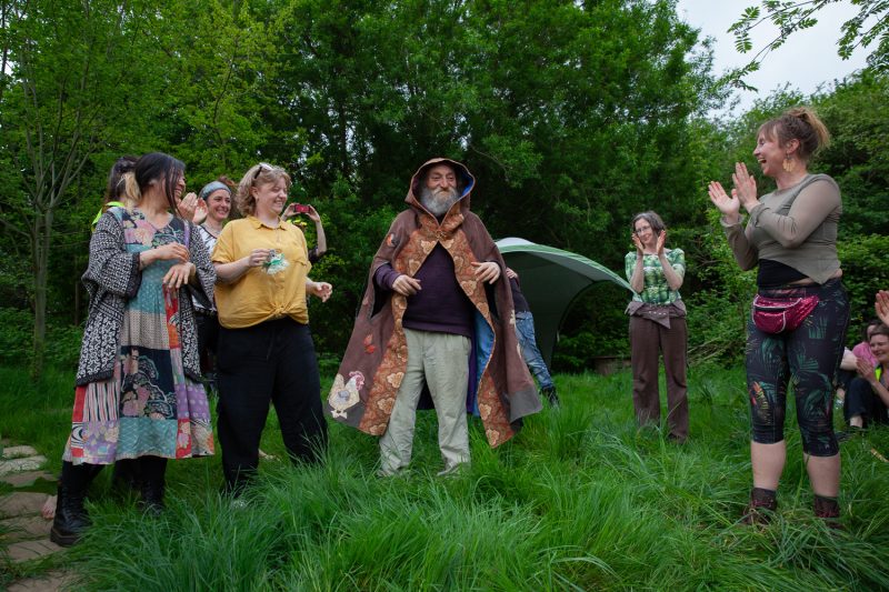 Mike was given a handmade cloak to mark his years of service to regenerative land networks home and abroad, in a gathering that took place at the Haven in Eastville – photo: Mark Simmons