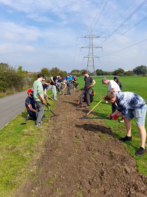 Community members got together to create wildflower strips at Lockleaze Sports Centre as part of the Community Climate Action Project ‘Really Wild Lockleaze’ – photo: Lockleaze Neighbourhood Trust