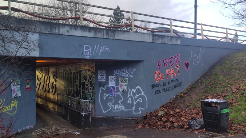 ‘Free Dr Pat’ graffiti appeared around Bristol this month, referencing the imprisonment of Horfield GP Dr Patrick Hart for his part in a 2022 climate protest. He is the first working GP to be jailed for climate-related action, which he said he felt compelled to take on behalf of the health of his patients – photo: Ursula Billington