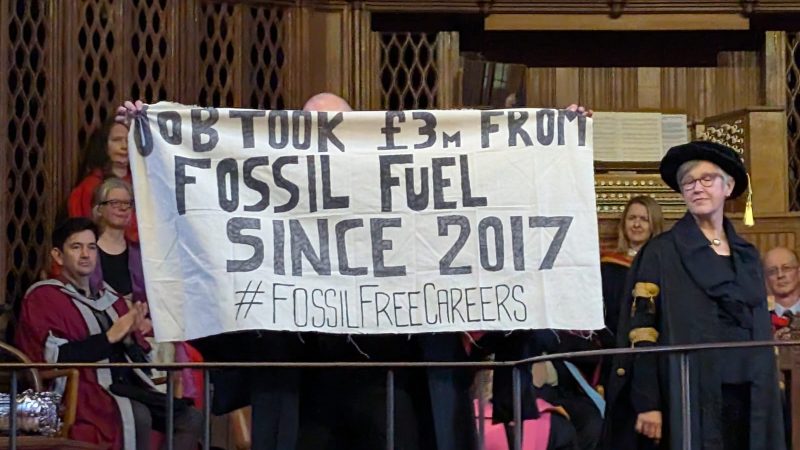 A student graduating with a Masters in Society, Politics and Climate took the opportunity of his graduation ceremony to protest the University of Bristol’s ongoing relationship with fossil fuel companies which he called ‘hypocrisy of the highest order’ – photo: Paddy Vipond