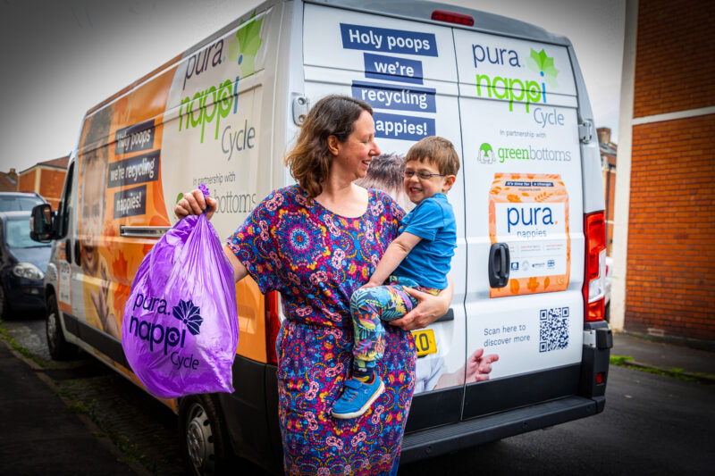 Bristol has begun England’s largest nappy recycling trial. Collections for participating families started on July 31. Absorbent hygiene products make up around 8 per cent of the city’s household general waste bins. The recycled nappies will be turned into notice boards, paving material for roads and cycle paths, and other items – photo: Pura