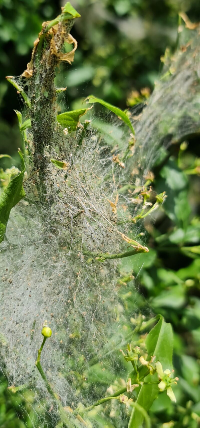 Spindle ermine moth’s nests are resident in the field behind the David Lloyd’s Club which backs on to Badock’s Wood. Community members are challenging a retrospective planning application by the Club which they say threatens the local environment due to impacts from light, noise and plastic pollution – photo: Friends of Badock’s Wood