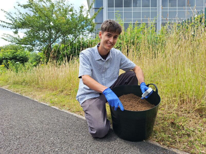 UWE student George Barnsley is involved in testing the resulting fertiliser on seeds grown in UWE’s large greenhouse which is used for research across biodiversity, environmental change, conservation and food security – photo: UWE Bristol