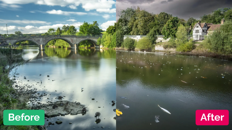 Wessex Water has ranked fifth in a ‘biggest sewage spill increase’ list, with a rise of nearly 20,000 to over 40,000 spills in 2023; it came second in terms of spill duration. This AI-produced image predicts what the River Severn – the mouth of which flows into the Bristol channel – will look like in 2050 if pollution continues unchecked – photo: Utility Bidders