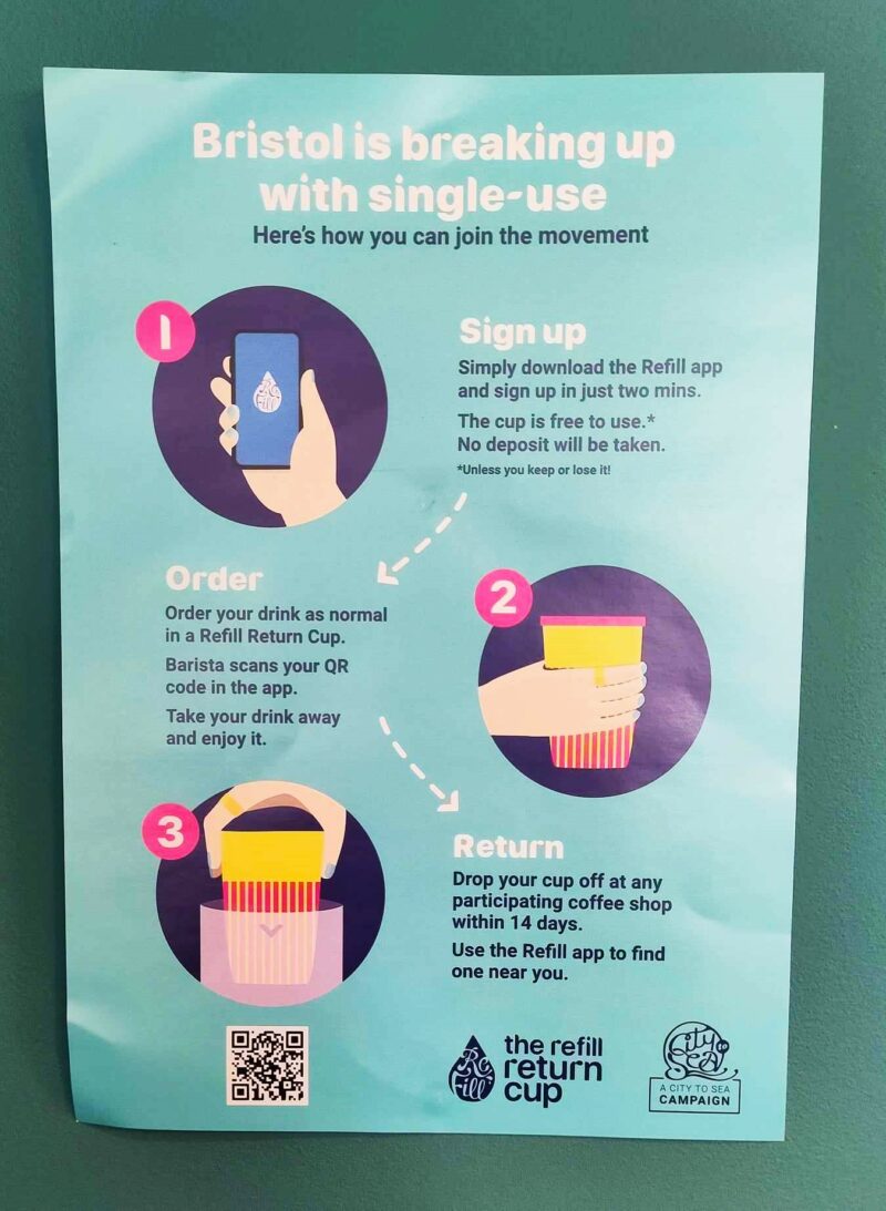 City to Sea is piloting an innovative coffee cup return scheme, using an app and QR code instead of the usual financial deposit, and with independent cafes all over Bristol involved to make it easier for people to return cups where convenient.