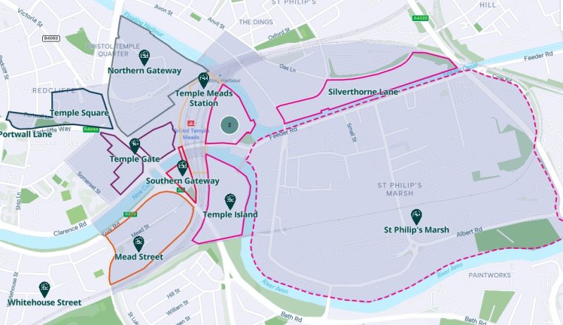 As well as affordable homes, job creation and ‘cultural celebration’, the proposals for Temple Quarter promise “environmental revitalisation for the region”, but Bristol Parks Forum says the space allocated for parks is too small for such a large housing development – image: MapBox