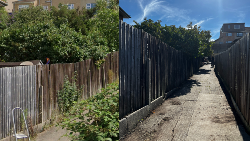 The littered alleyway with wild growth all over has now been cleared, and will soon look green and beautiful – photos: Google Maps (left) and Karen Johnson (right)