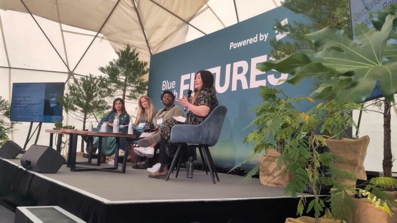 Foluke Adebisi chairing the panel discussion on decolonising the outdoors at the Blue Earth Summit in Bristol – photo: Ursula Billington
