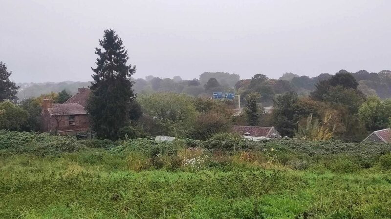 The roofs of the Bridge Farm barns and farmhouse can be seen from the top of the site’s hill, with the M32 in the background – photo: Ursula Billington