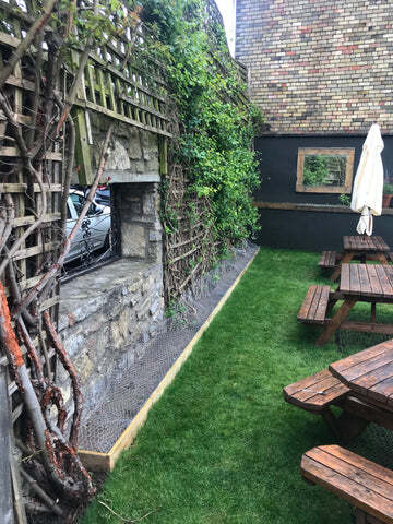 Before: the garden of the Spotted Cow just after a strip of lawn wall-side had been dug and turned into a bed for wildflowers