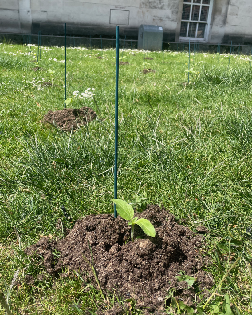 Eventually, the installation – if the sunflowers are able to grow – will have white canes behind each one, symbolising war graves.