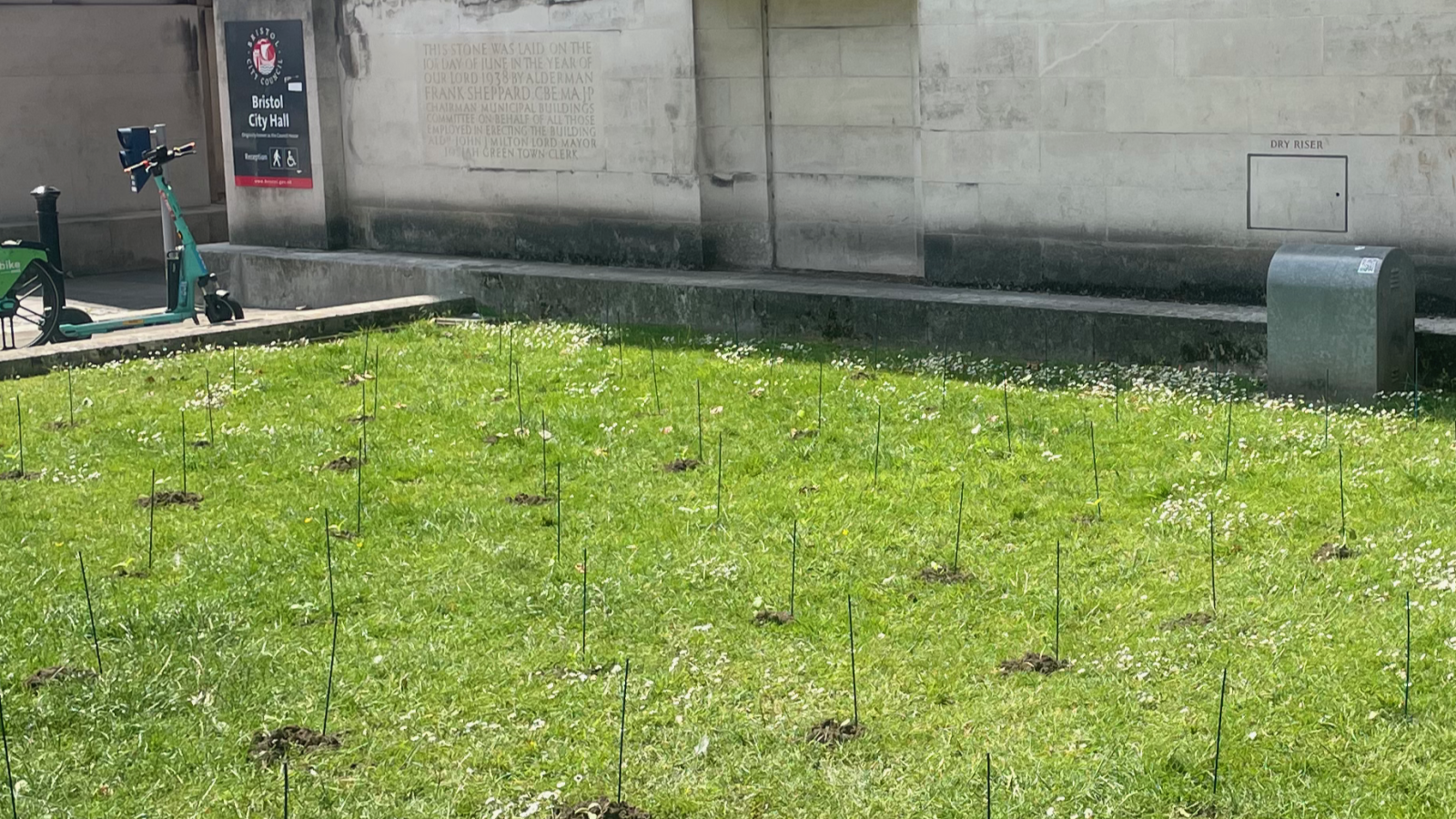 After coming into some resistance from council security staff, the artist worked in three sessions to first create a grid on the grass before digging the holes and planting the flowers.