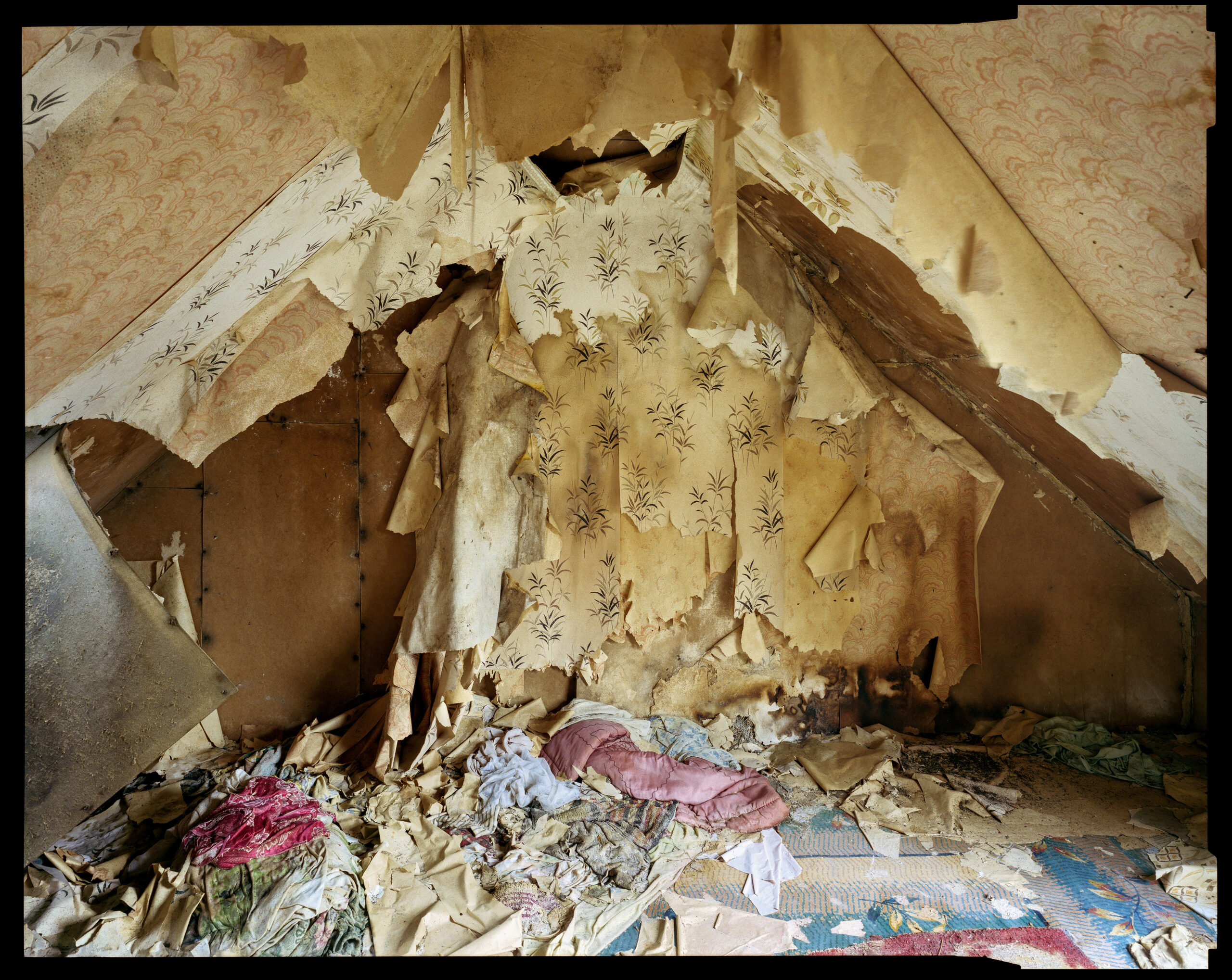 In fellow photographer Aaron Schuman’s words: “The details and detritus within these pictures – the stranded furnishings, clothing, cooking implements, peeling wallpapers, decorative artworks and piles of literature – hint at the richness of experience that these walls once sheltered, and at the same time reveal the fragility of such an existence when left exposed to the elements, the economy and the passage of time”.