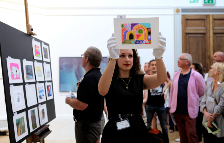 Each week, the red feathers “come to the studio and at 5.30pm on the dot, they’re given a title. Each week it’s a different title and until that point the artists don’t know what it is. And then they have two hours max to produce a painting.”