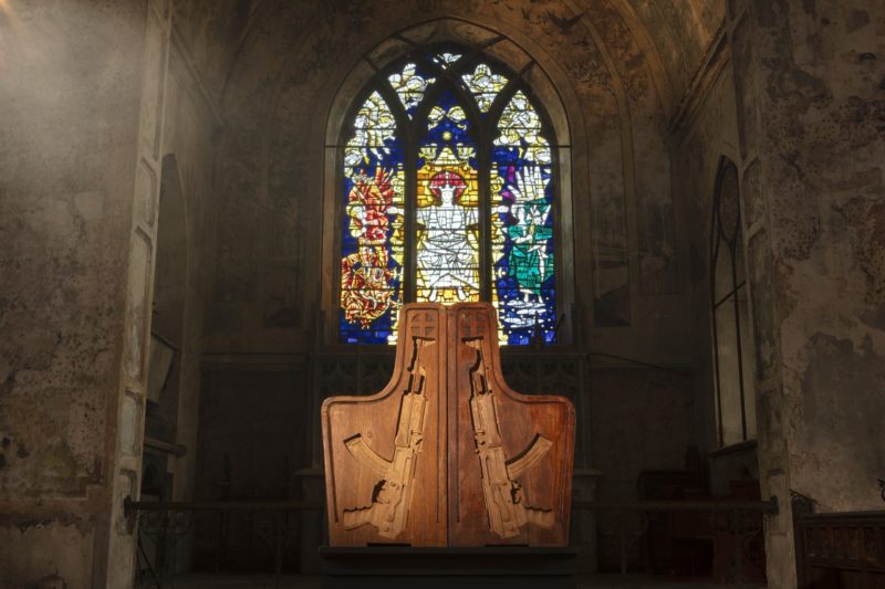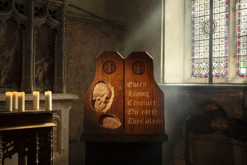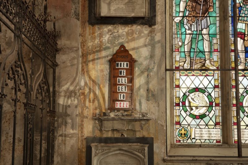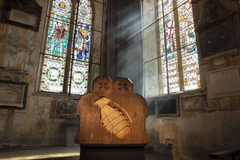 His latest body of work I Don’t Like Sundays is a set of 12 mixed media pieces and wood carvings, made from reclaimed church pews, hymn boards and panels, exploring his personal experience of ‘violence resulting from religious influence’.