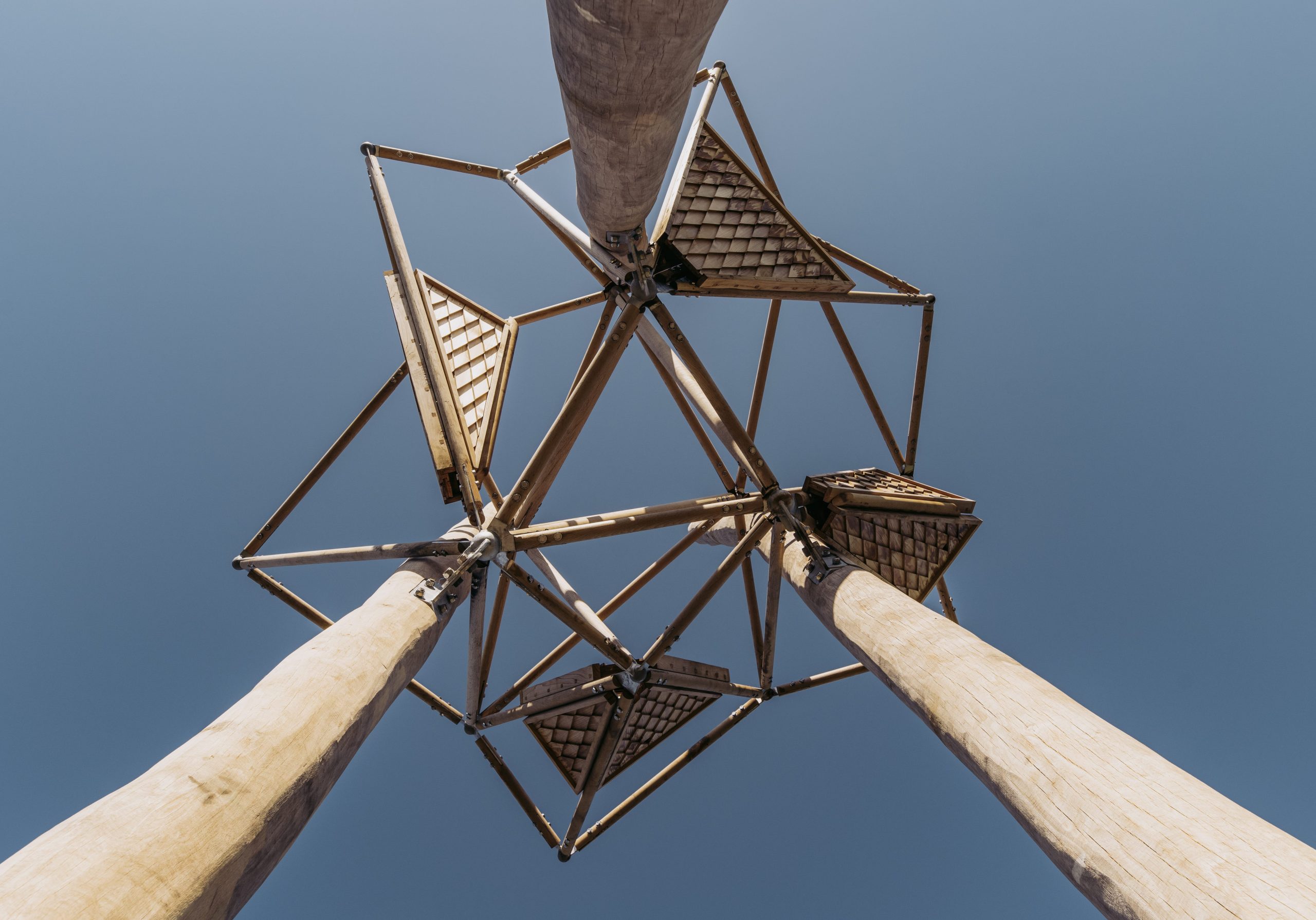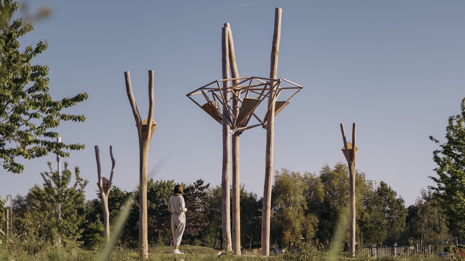 Standing high above the meadow, the centrepiece of their installation is a tower-like geometric-inspired structure clad in cedar shingles. Around it, cluster a number of separate boxes in which wildlife can nest or take shelter.