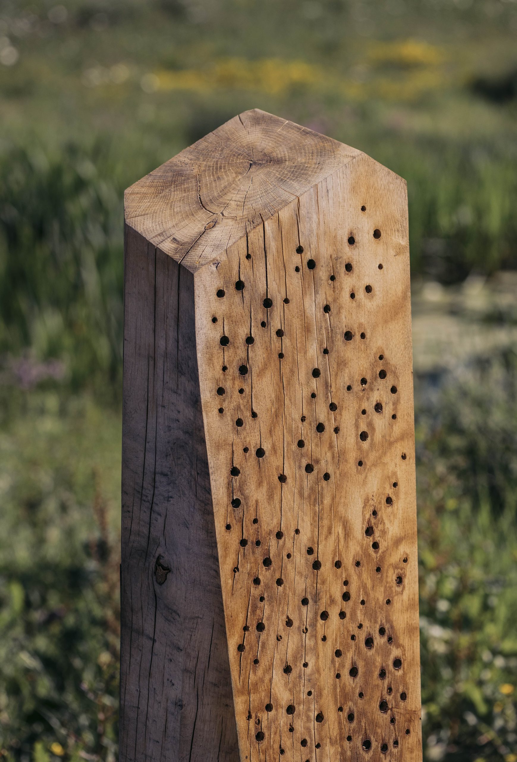 Using ethical materials including English oak and Robinia timber, Denman+Gould have crafted sculptural pieces to support a range of invertebrates, birds, bats and pollinators such as bees, butterflies and moths.