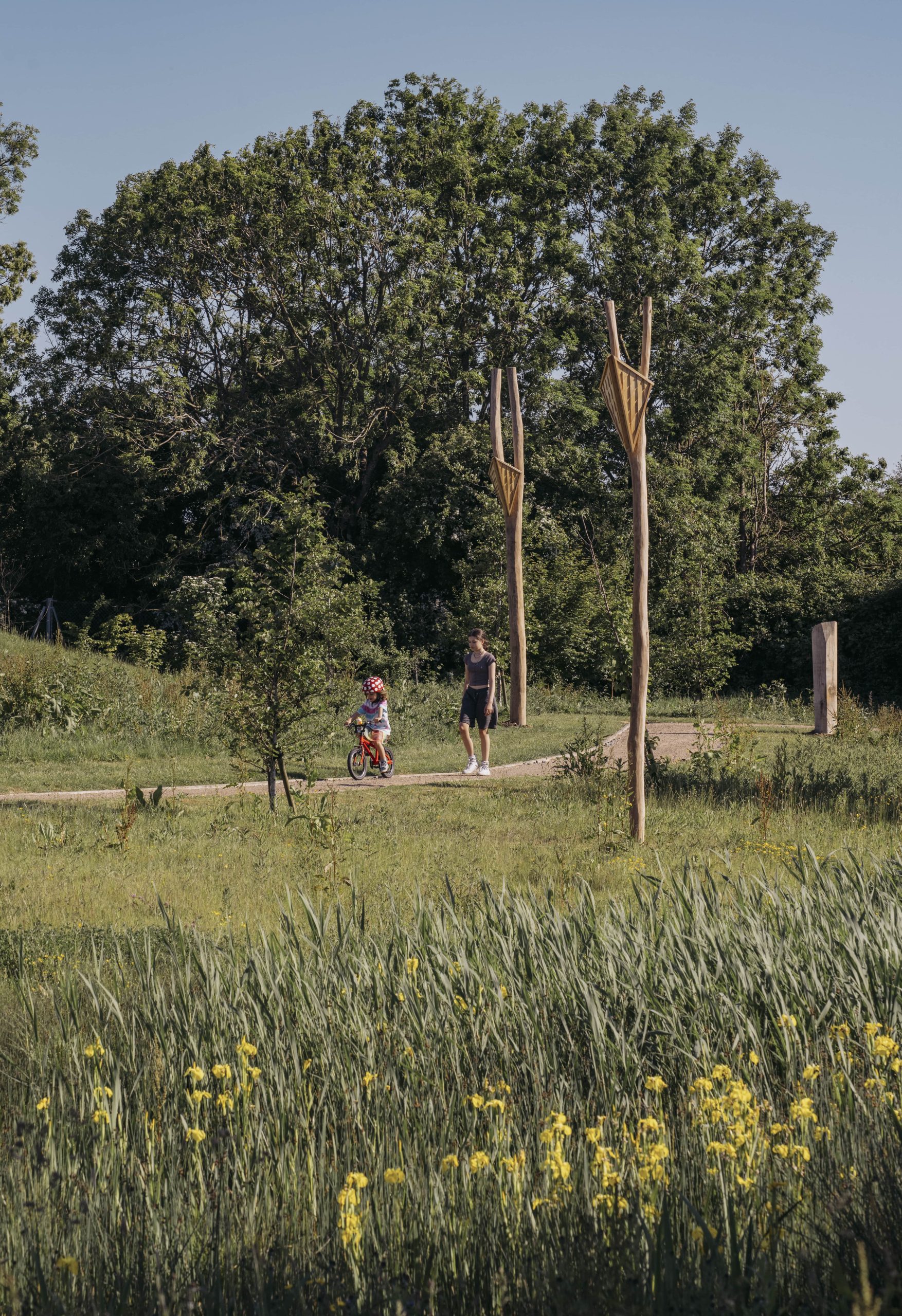 A series of site-specific artworks are now set within meadow planting, pre-existing mature trees, and a newly created pond, to help support biodiversity and reconnect – or deepen the relationship – between humanity and the local pockets of nature that surround them.