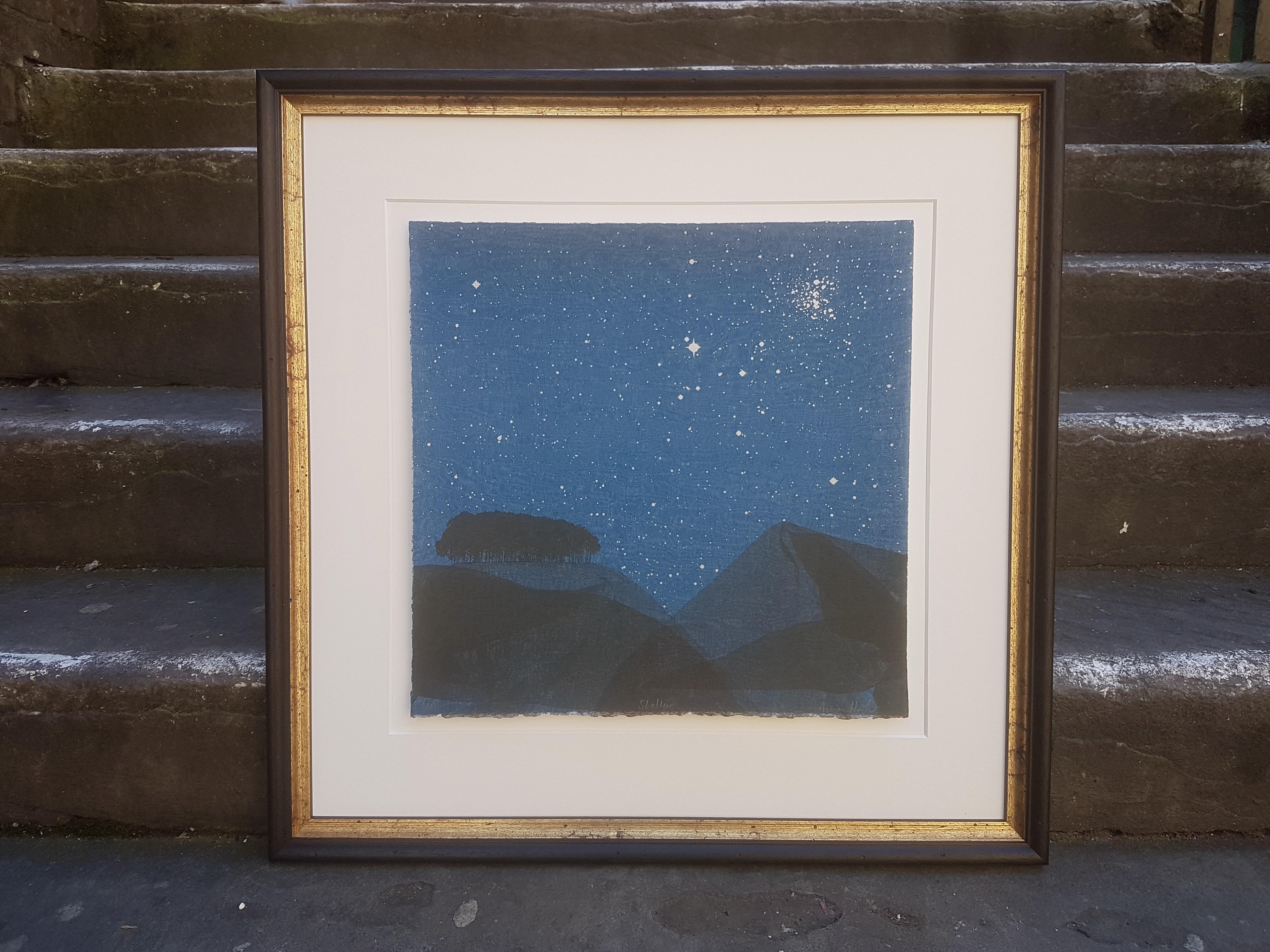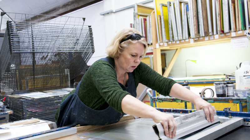 “Screen-print is a planographic print prices. You print on to paper through a screen, so the image is not reversed, or mirrored, like it is with other print processes. Each layer of this print involves a new exposure, allowing me to build up the print from separate layers that can be printed in any given colour. This print has five separate layers.