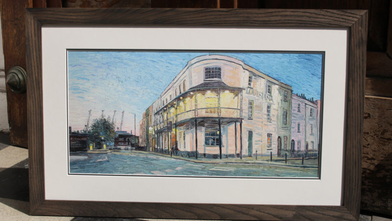 Oliver painted The Louisiana several years ago in his Stokes Croft studio. It was a commission from a client with a special affection for the live music venue. The two of them did a lot of conferring over photographs and notes before deciding on the final design. To paint it, Oliver used the impasto technique of applying oils thickly on the canvas, which gives the finished work a highly textured look. It took him about a week to complete.