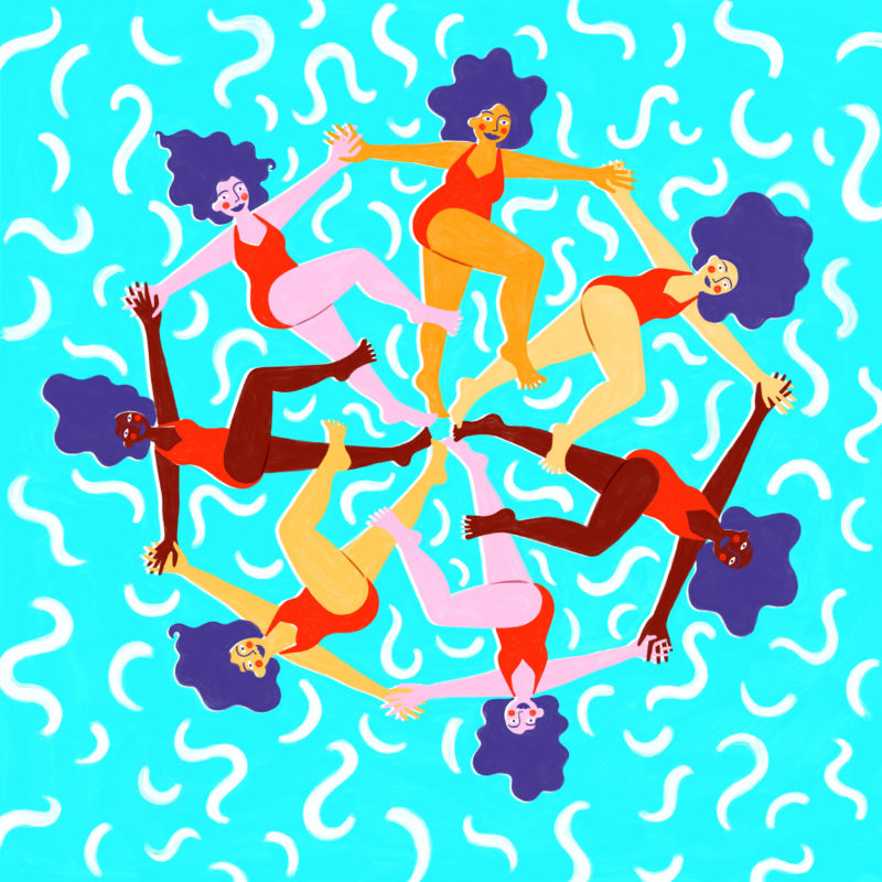 “For this piece, much like making a screen print, I made each colour layer separately and combined sketching and painting with digital techniques. I then created the layers of pink, blue and yellow, which are overlaid to create tertiary colours like green and orange.”