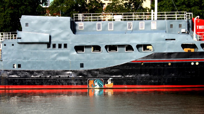 Return of the Grim Reaper, by Bristol street artist John D’Oh, is a temporary installation stuck on with magnets on the side of the boat facing the Floating Harbour.