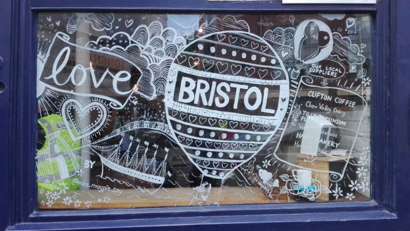 In the drawing, we see the family on a fancy car travelling over the Clifton Suspension Bridge, and the illustrator, Niki, traveling in a hot air balloon – a real symbol of Bristol. A list of the local suppliers who stock the coffee shop is also written up on the window, to show that the business is all about local support.