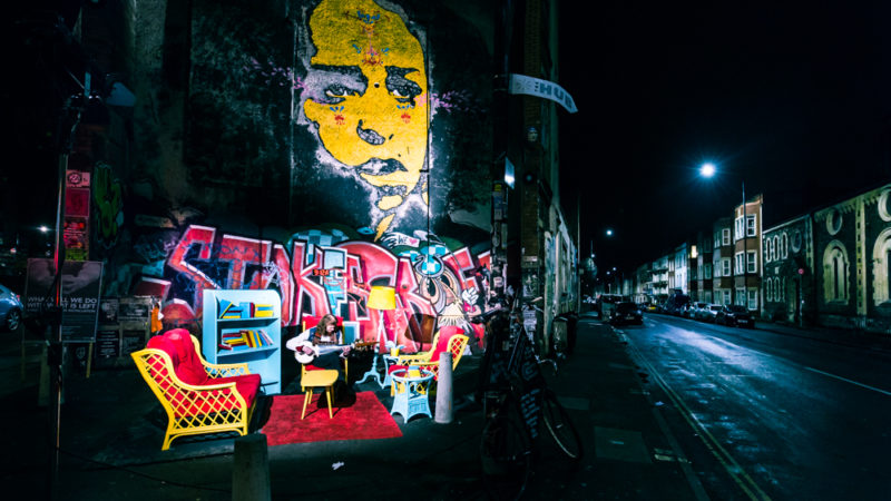 This summer’s project from fine-art photographer and Stokes Croft resident Claudio Ahlers was an art installation set, that saw 24 hours’ worth of camera action create an authentic insight into Bristol’s most dynamic neighbourhood. With a set styled like a living room erected on the corner of City Road for one day only, 24H Our City: People of the Croft was theatre maker Sarah Middleton’s job to bring a home-from-home atmosphere to the busy junction.