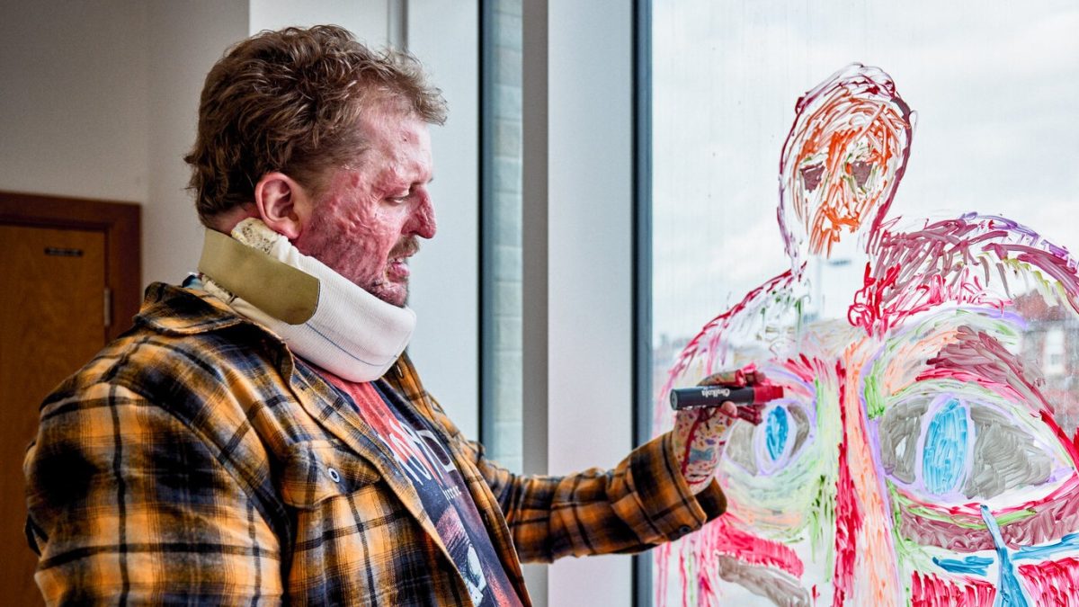 Big Jeff has been adding a splash of colour to Southmead Hospital during his recovery from serious burns suffered in a house fire.