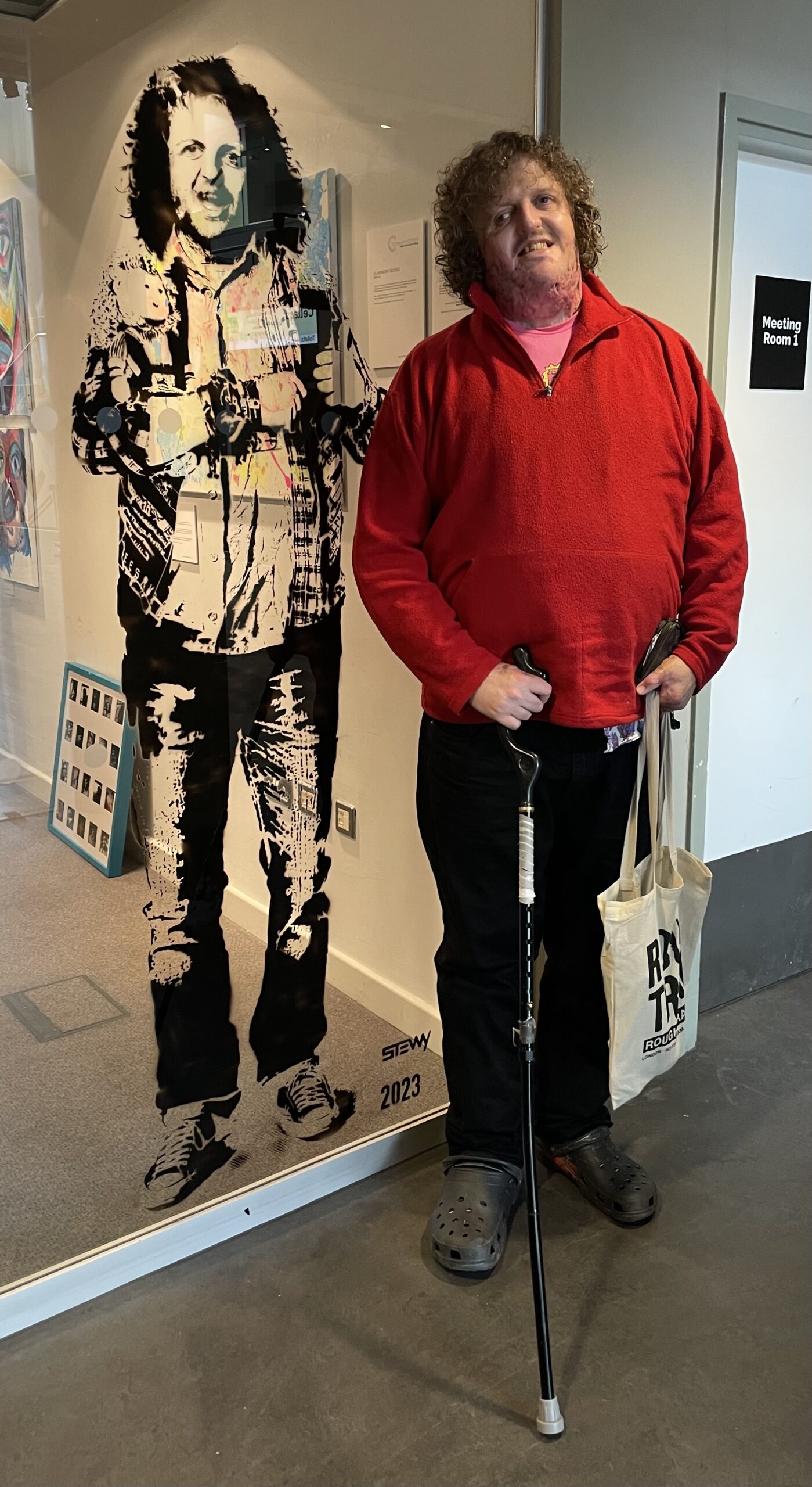 Prolific gig-goer and artist Big Jeff outside his new exhibition at the Bristol Beacon, next to a stencil of him by Stewy – photo: Martin Booth