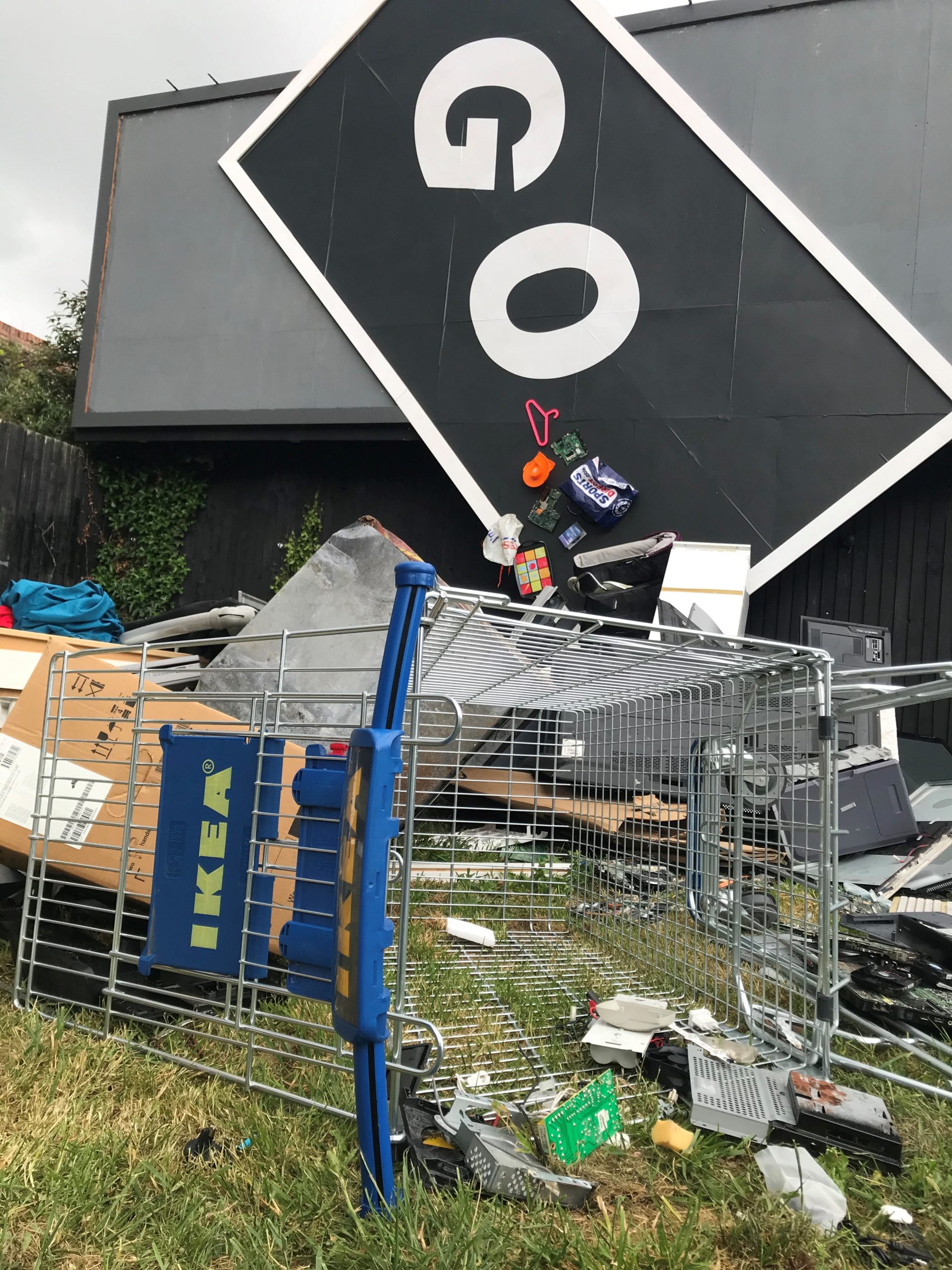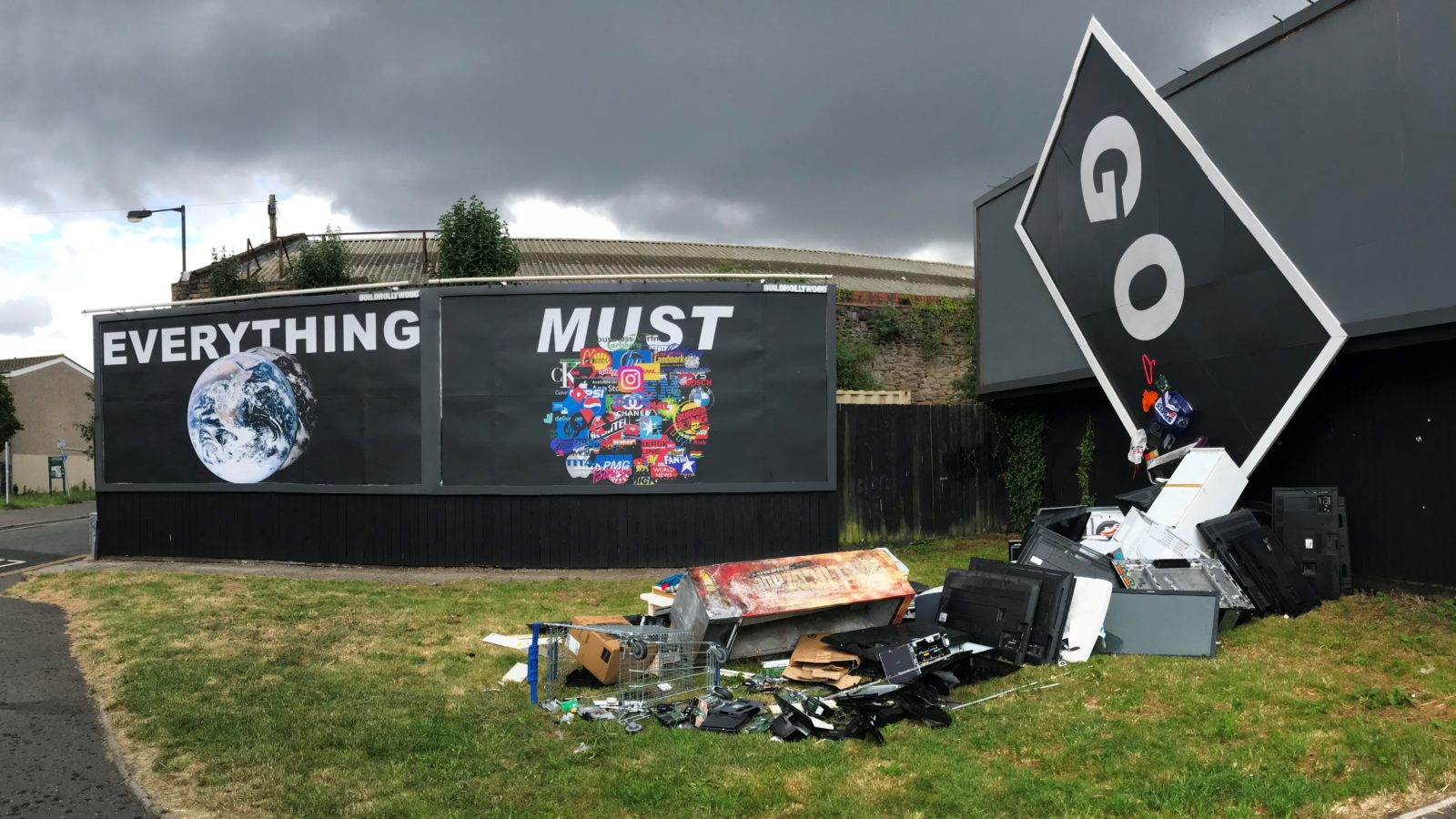 An assortment of consumer goods and domestic waste from a Sports Direct plastic bag to an Ikea trolley appears to spill out of the third billboard which has been tipped at an angle.