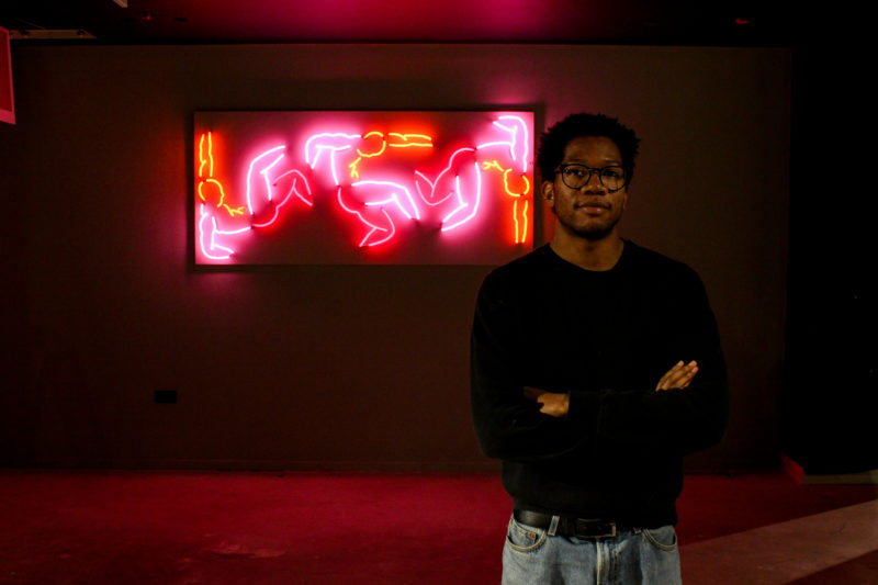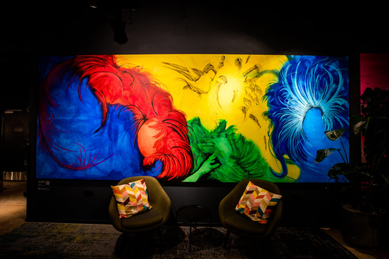 His neon artwork is now on display in the lobby area of the Moxy. It began as a digital line drawing and was brought to fruition by signmakers Cabot Neon.