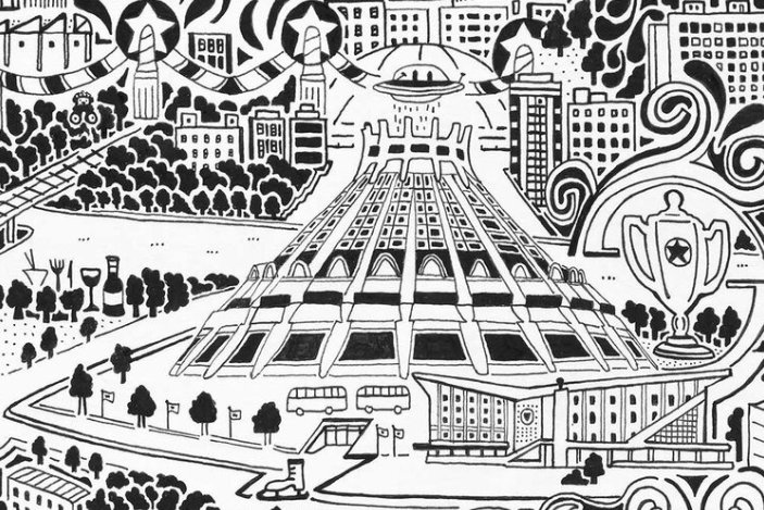 Pyongyang Ice Rink: “An indoor venue on the bank of the Pothong River. This eccentric brutalist building is a particular favourite of mine. It stands to attention on a flat open space, like a lost shuttlecock from the stadium next door.”