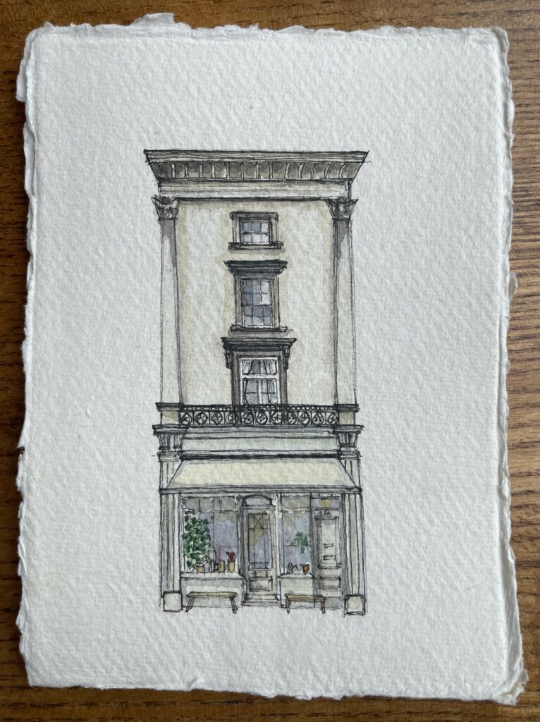 Scaling slightly up, her pen and watercolour drawings take several hours, painted on a vintage desk at her home in Redland that had to be carried over a neighbour’s wall to fit in her house.