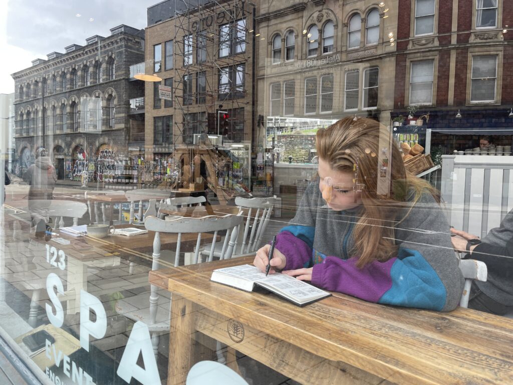 On a recent morning, Poppy Jackson is sitting at a window seat in Elemental overlooking Stokes Croft, hard at work sketching in tiny detail the exterior of the cafe she is sitting within.