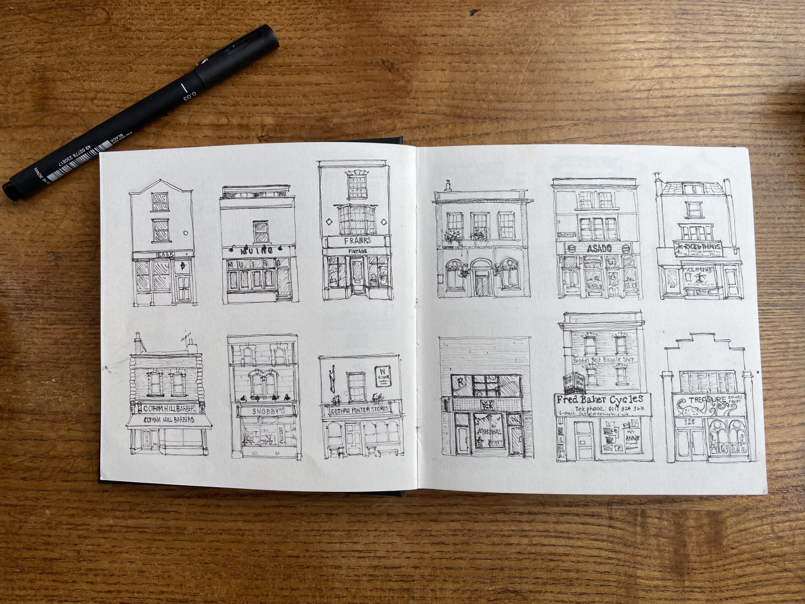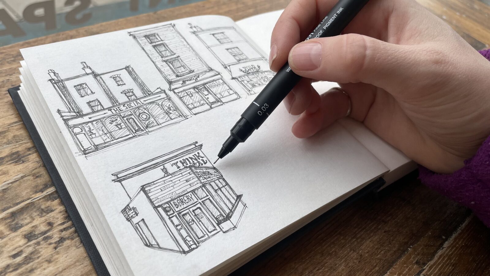 Poppy’s small sketches, each around 5cm high, are drawn with a Uni-Ball pen with an ultra-fine 0.03 tip on a sketchpad made by Seawhite of Brighton.
