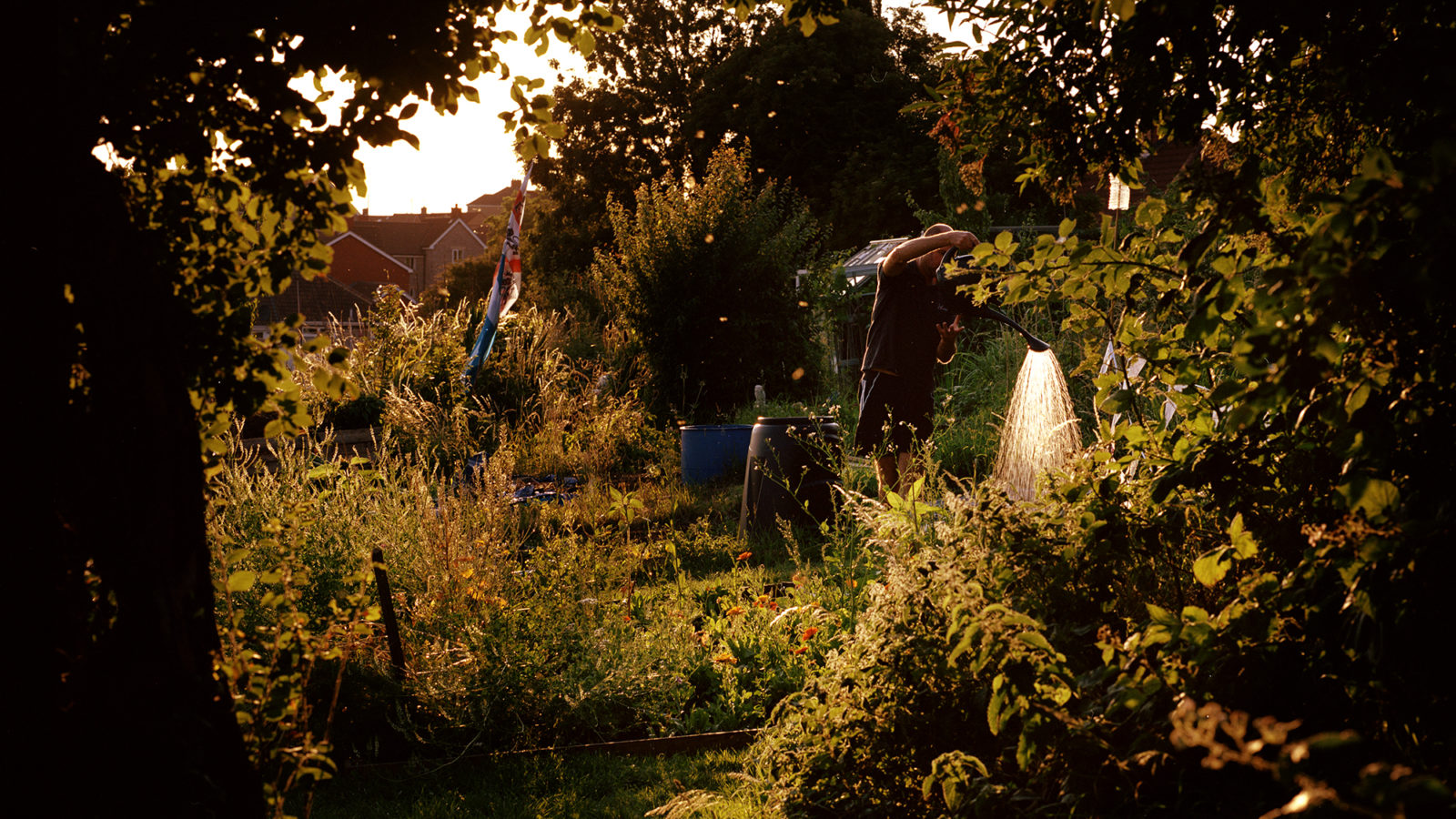 A photo of Mike Feingold in his greenhouse, part of the He is well known within the Bristol growing community, particularly because of the role he has played in promoting the philosophy of Permaculture and running an orchard with 50 different varieties of apple, May 2020.