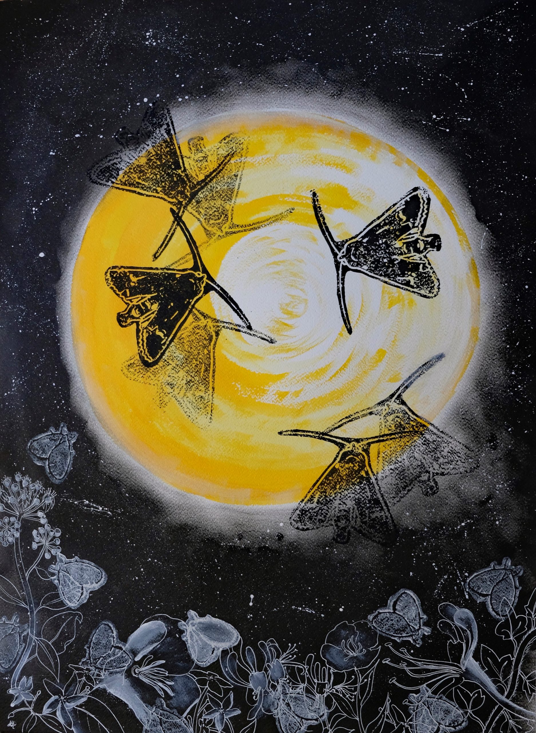 Alicia used lino print and ink to reflect the dazzling, chaotic, confusing manner in which moths are attracted to light – Photo: Alicia Hayland